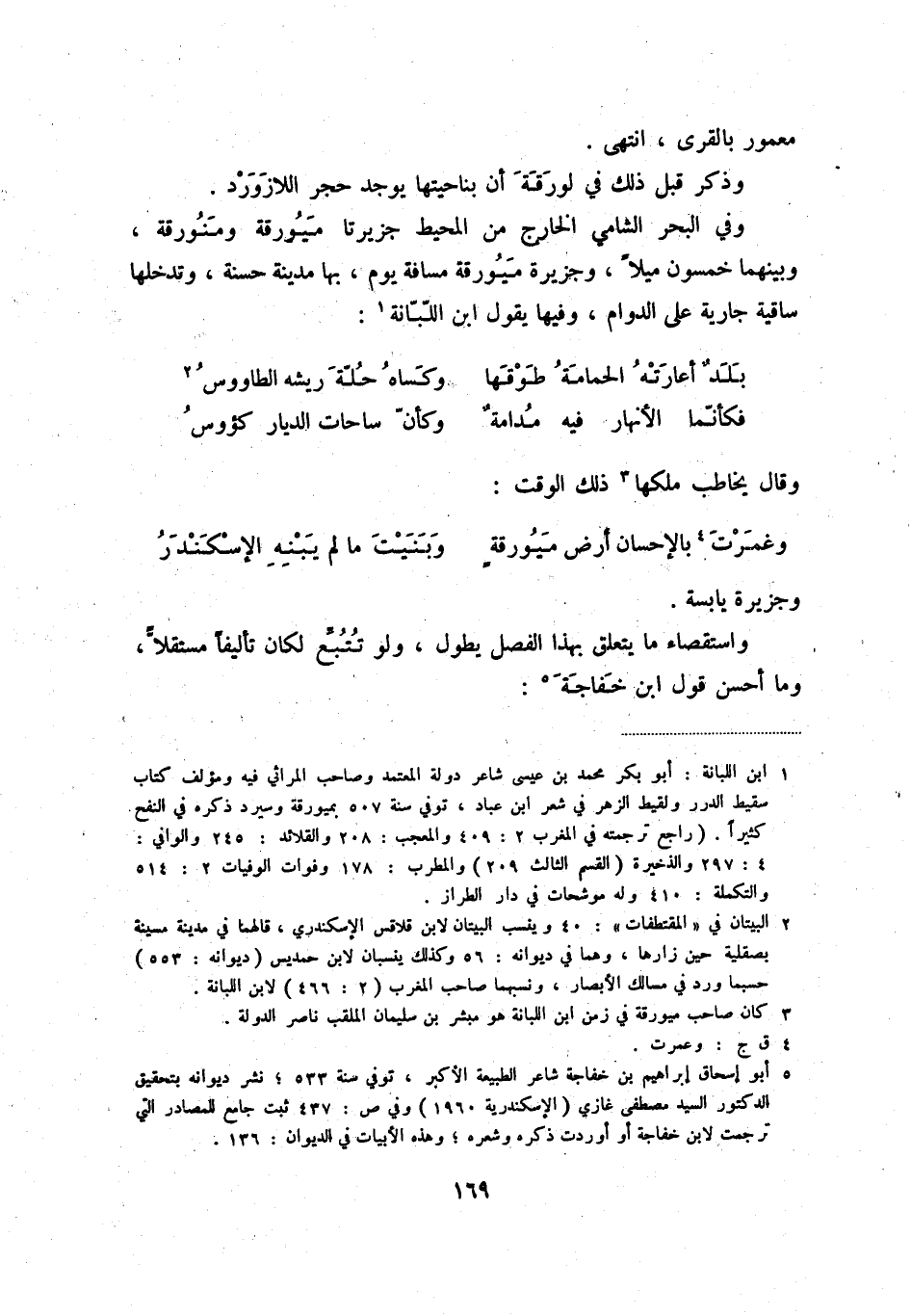 (5) أبو إسحاق إبراهيم بن خفاجة شاعر الطبيعة الأكبر، توفي سنة 523؛ نشر ديوانه بتحقيق الدكتور السيد مصطفى غازي (الإسكندرية 1960) وفي ص: 437 ثبت جامع للمصادر التي ترجمت لابن خفاجة أو أوردت ذكره وشعره؛ وهذه الأبيات في الديوان: 136.