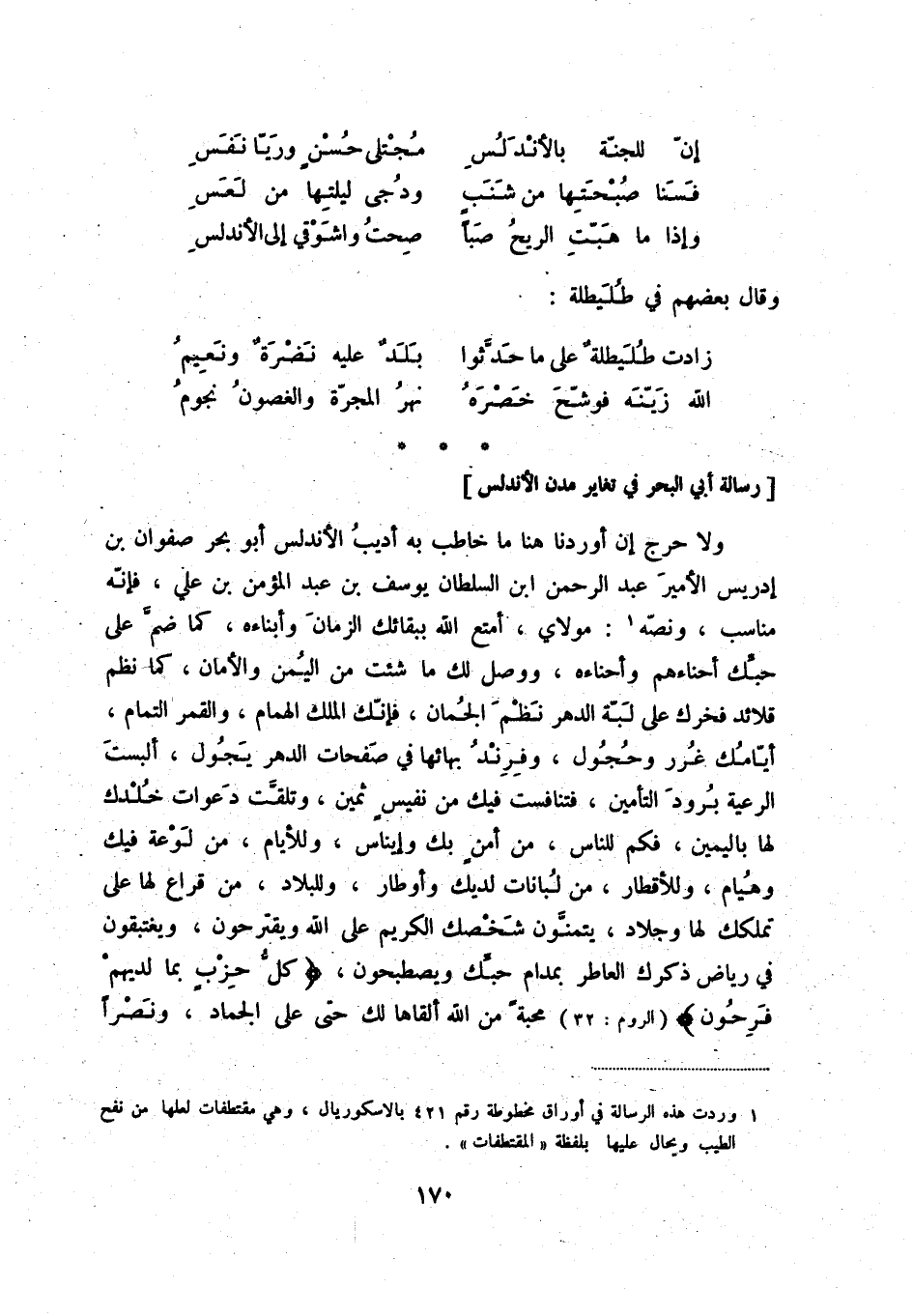(1) وردت هذه الرسالة في أوراق مخطوطة رقم 421 بالإسكوريال، وهي مقتطفات لعلها من نفح الطيب ويحال عليها بلفظة " المقتطفات ".