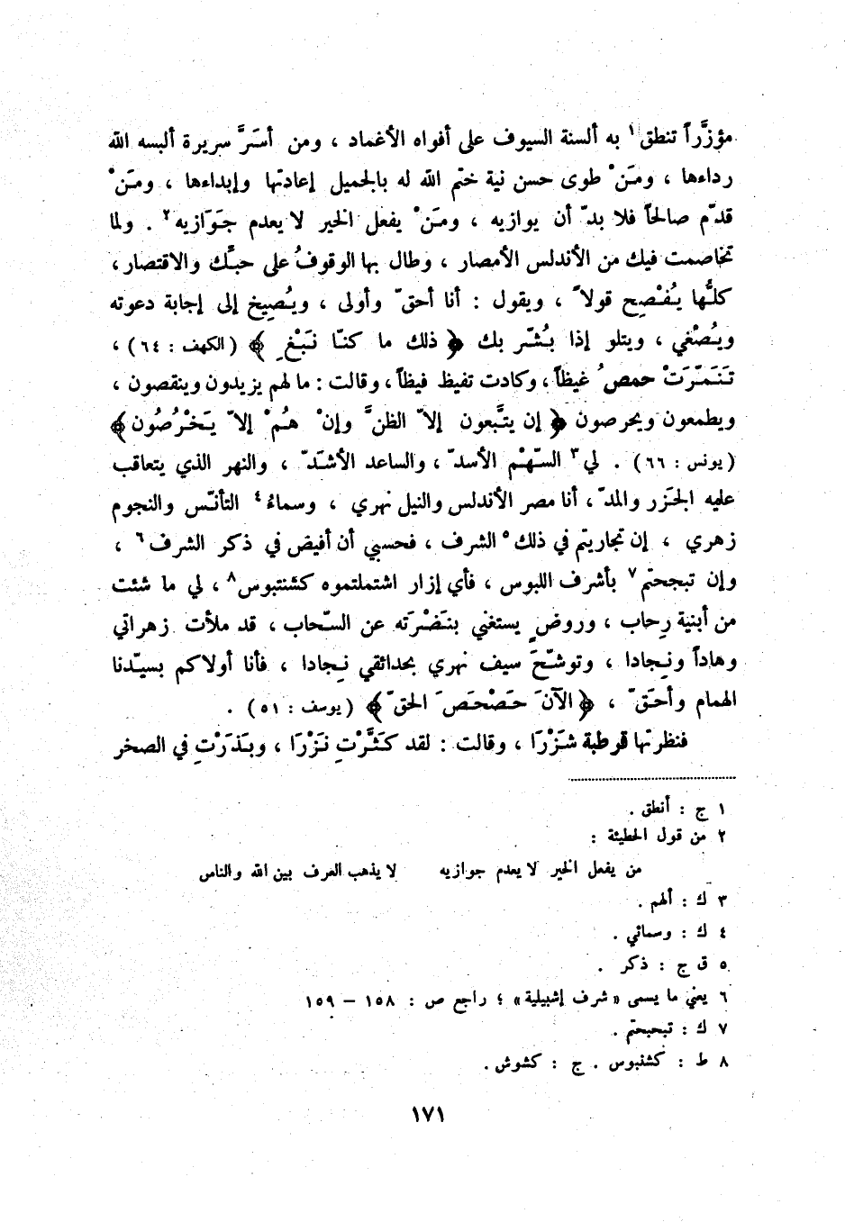 مؤزّراً تنطق (1) به ألسنة السيوف على أفواه الأغماد، ومن أسرّ سريرة ألبسه الله رداءها، ومن طوى حسن نية ختم الله له بالجميل إعادتها وإبداءها، ومن قدّم صالحاً فلا بدّ أن يوازيه، ومن يفعل الخير لا يعدم جوازيه (2) . ولما تخاصمت فيك من الأندلس الأمصار، وطال بها الوقوف على حبّك والاقتصار، كلّها يفصح قولاً، ويقول: أنا أحقّ وأولى، ويصيخ إلى إجابة دعوته ويصغي، ويتلو إذا بشّر بك " ذلك ما كنّا نبغ "، تنمّرت حمص غيظاً، وكادت تفيظ فيظاً، وقالت: ما لهم يزيدون وينقصون، ويطمعون ويحرصون " إن يتّبعون إلاّ الظنّ وإن هم إلاّ يخرصون ". لي (3) السّهم الأسدّ، والساعد الأشدّ، والنهر الذي يتعاقب عليه الجزر والمدّ، أنا مصر الأندلس والنيل نهري، وسماء (4) التأنّس والنجوم زهري، إن تجاريتم في ذلك (5) الشرف، فحسبي أن أفيض في ذكر الشرف (6) ، وإن تبجحتم (7) بأشرف اللبوس، فأي إزار اشتملتموه كشنتبوس (8) ، لي ما شئت من أبينة رحاب، وروضٍ يستغني بنضرته عن السّحاب، قد ملأت زهراتي وهاداً ونجاداً، وتوشّح سيف نهري بحدائقي نجاداً، فأنا أولاكم بسيّدنا الهمام وأحقّ، " الآن حصحص الحق ".