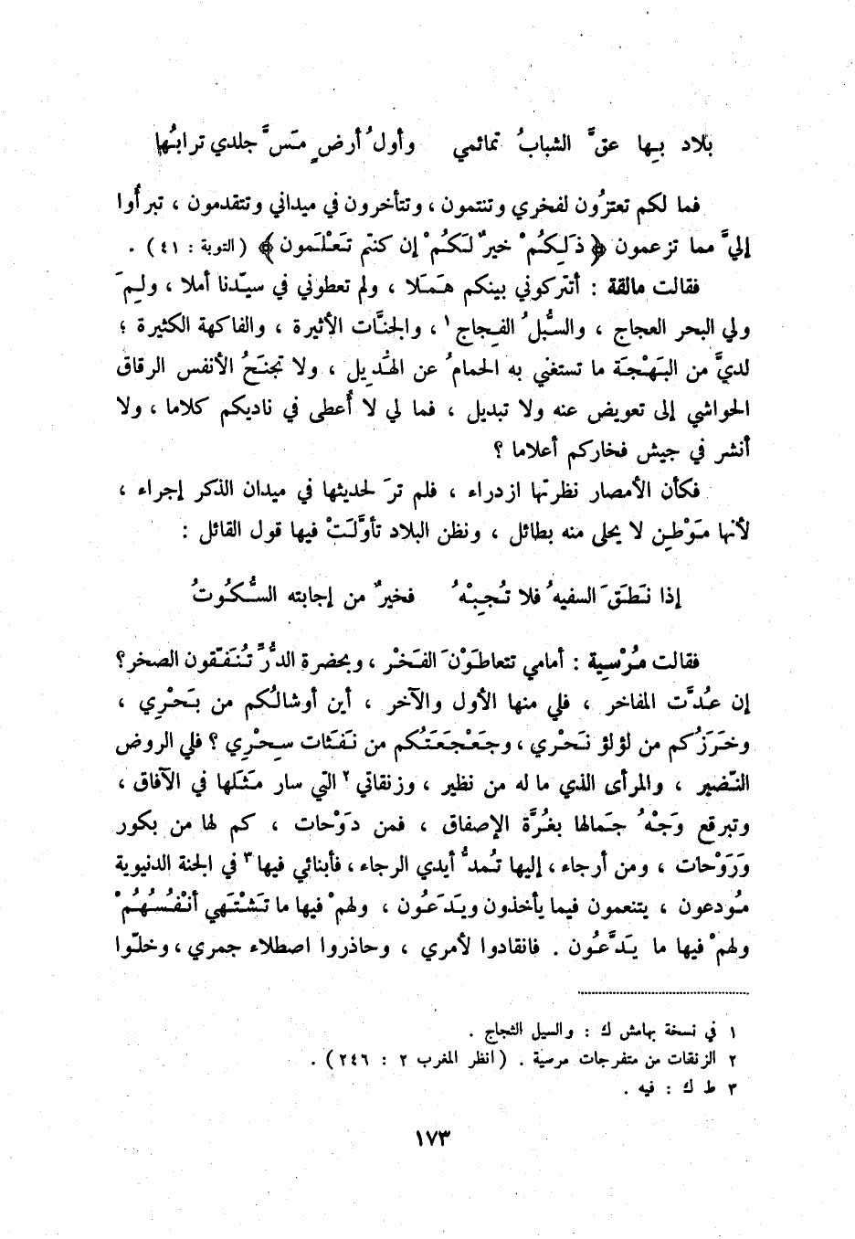 إذا نطق السفيه فلا تجبه ... فخيرٌ من إجابته السّكوت فقالت مرسية: أمامي تتعاطون الفخر، وبحضرة الدّرّ تنفّقون الصخر؟ إن عدّت المفاخر، فلي منها الأول والآخر، أين أوشالكم من بحري، وخرزكم من لؤلؤ نحري، وجعجعتكم من نفثات سحري؟ فلي الروض النّضير، والمرأى الذي ما له من نظير، وزنقاتي (2) التي سار مثلها في الآفاق، وتبرقع وجه جمالها بغرّة الإصفاق، فمن دوحات، كم لها من بكور وروحات، ومن أرجاء، إليها تمدّ أيدي الرجاء، فأبنائي فيها (3) في الجنة الدنيوية مودعون، يتنعمون فيما يأخذون ويدعون، ولهم فيها ما تشتهي أنفسهم ولهم فيها ما يدّعون. فانقادوا لأمري، وحاذروا اصطلاء جمري، وخلّوا