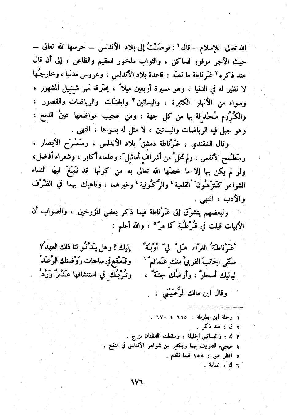 الله تعالى للإسلام - قال (1) : فوصلت إلى بلاد الأندلس - حرسها الله تعالى - حيث الأجر موفور للساكن، والثواب مذخور للمقيم والظاعن، إلى أن قال عند ذكره (2) غرناطة ما نصّه: قاعدة بلاد الأندلس، وعروس مدنها، وخارجها لا نظير له في الدنيا، وهو مسيرة أربعين ميلاً، يخترقه نهر شنيل المشهور، وسواه من الأنهار الكثيرة، والبساتين (3) والجنّات والرياضات والقصور، والكروم محدقة بها من كل جهة، ومن عجيب مواضعها عين الدمع، وهو جبل فيه الرياضات والبساتين، لا مثل له بسواها، انتهى.