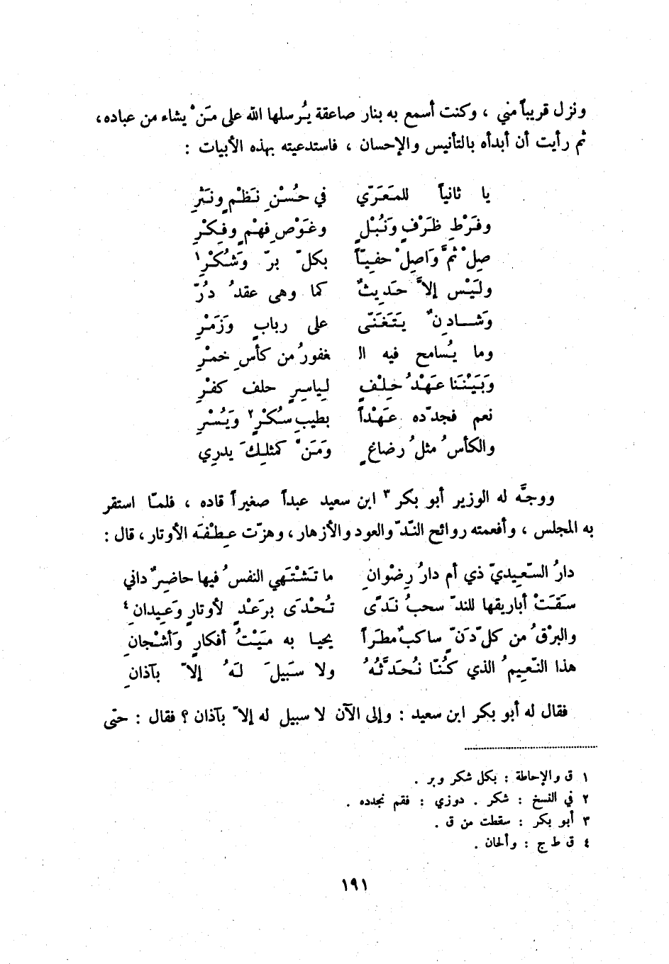 هذا النّعيم الذي كنّا نحدّثه ... ولا سبيل له إلاّ بآذان فقال له أبو بكرٍ ابن سعيدٍ: وإلى الآن لا سبيل له إلاّ بآذان؟ فقال: حتى