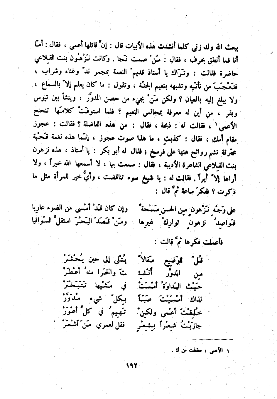يبعث الله ولد زنى كلما أنشدت هذه الأبيات قال: إنّ قائلها أعمى، فقال: أمّا أنا فما أنطق بحرفٍ، فقال: من صمت نجا. وكانت نزهون بنت القلاعي حاضرةٌ فقالت: وتراك يا أستاذ قديم النعمة بمجمر ندّ وغناء وشراب، فتعجب من تأتّيه وتشبهه بنعيم الجنّة، وتقول: ما كان يعلم إلاّ بالسماع، ولا يبلغ إليه بالعيان؟ ولكن من يجيء من حصن المدوّر، وينشأ بين تيوس وبقر، من أين له معرفة بمجالس النعيم؟ فلما استوفت كلامها تنحنح الأعمى (1) ، فقالت له: ذبحة، فقال من هذه الفاضلة؟ فقالت: عجوز مقام أمك، فقال: كذبت، ما هذا صوت عجوز، إنّما هذه نغمة قحبة محترقة تشم روائح هنها على فرسخ؛ فقال له أبو بكر: يا أستاذ، هذه نزهون بنت القلاعي الشاعرة الأديبة، فقال: سمعت بها، لا أسمعها الله خيراً، ولا أراها إلاّ أيراً. فقالت له: يا شيخ سوء تناقضت، وأيّ خير للمرأة مثل ما ذكرت؟ ففكر ساعة ثمّ قال: