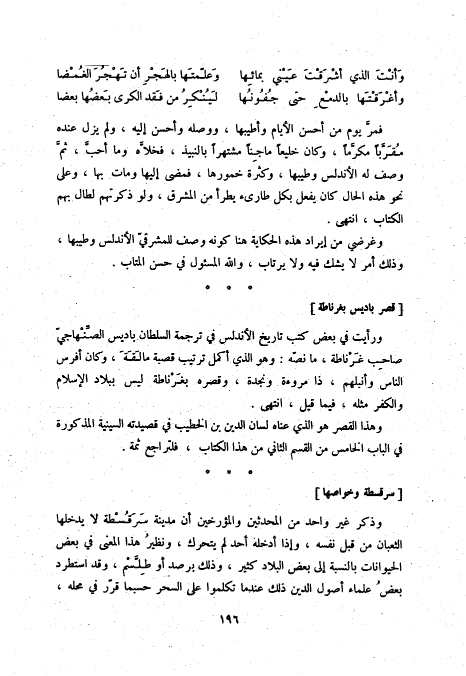 ورأيت في بعض كتب تاريخ الأندلس في ترجمة السلطان باديس الصّنهاجيّ صاحب غرناطة، ما نصّه: وهو الذي أكمل ترتيب قصبة مالقة، وكان أفرس الناس وأنبلهم، ذا مروءةٍ ونجدةٍ، وقصره بغرناطة ليس ببلاد الإسلام والكفر مثله، فيما قيل، انتهى.