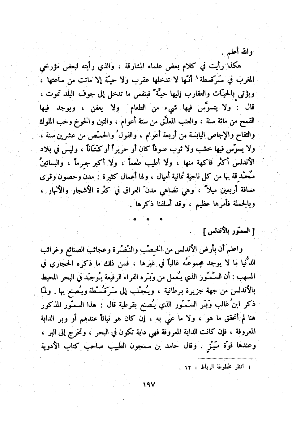 واعم أن بأرض الأندلس من الخصب والنّضرة وعجائب الصنائع وغرائب الدّنيا ما لا يوجد مجموعه غالباً في غيرها، فمن ذلك ما ذكره الحجاري في المسهب: أن السّمّور الذي يعمل من وبره الفراء الرفيعة يوجد في البحر المحيط بالأندلس من جهة جزيرة برطانية، ويجلب إلى سرقسطة ويصنع بها. ولما ذكر ابن غالب وبر السّمّور الذي يصنع بقرطبة قال: هذا السمّور المذكور هنا لم أتحقق ما هو، ولا ما عني به، إن كان هو نباتاً عندهم أو وبر الدابة المعروفة، فإن كانت الدابة المعروفة فهي دابةٌ تكون في البحر، وتخرج إلى البر، وعندها قوّة ميزٍ. وقال حامد بن سمجون الطبيب صاحب كتاب الأدوية