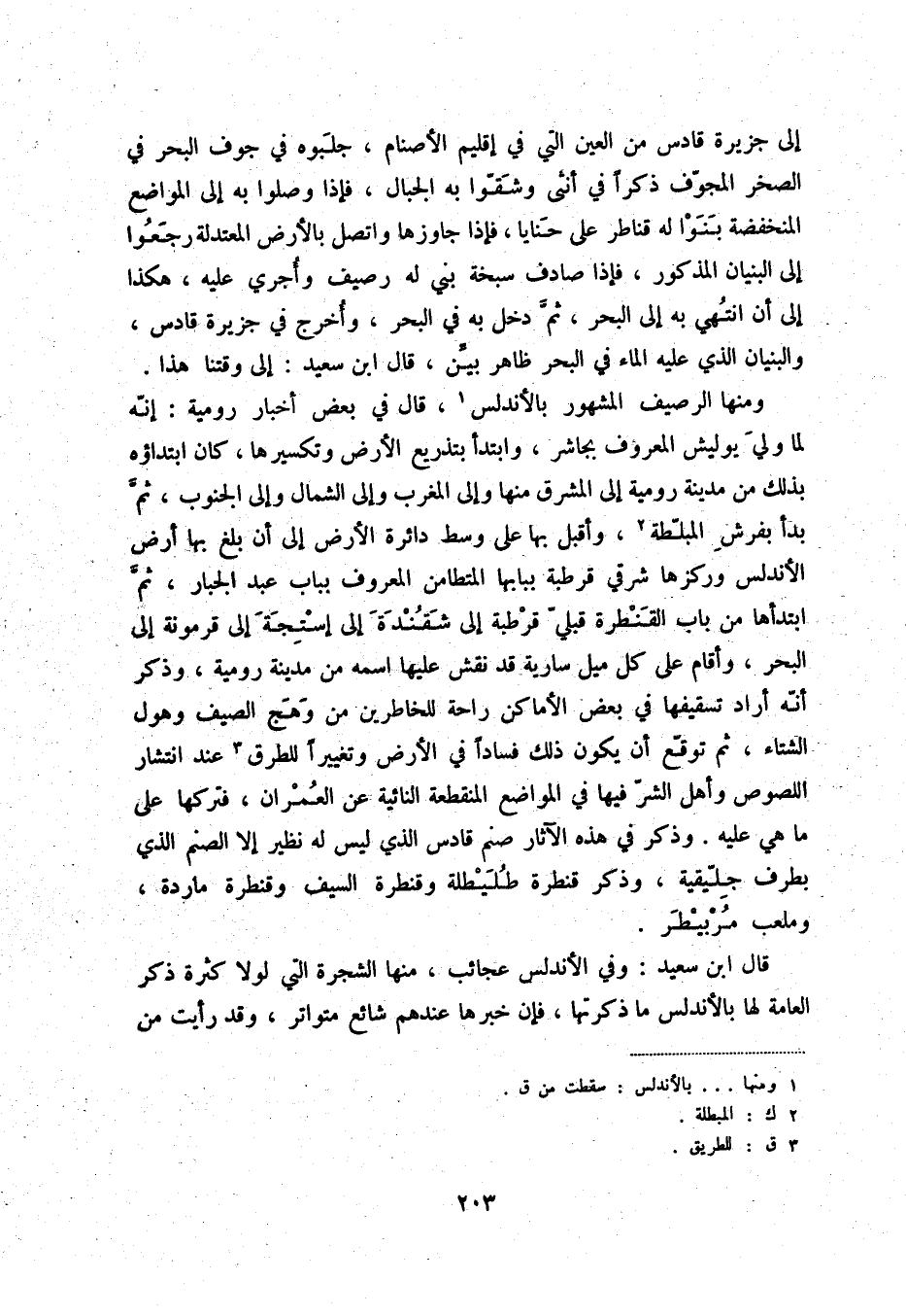 ومنها الرصيف المشهور بالأندلس (1) ، قال في بعض أخبار رومية: إنّه لما وليّ يوليش المعروف بجاشر، وابتدأ بتذريع الأرض وتكسيرها، كان ابتداؤه بذلك من مدينة رومية إلى المشرق منها وإلى المغرب وإلى الشمال وإلى الجنوب، ثمّ بدأ بفرش المبلّطة (2) ، وأقبل بها على وسط دائرة الأرض إلى أن بلغ بها أرض الأندلس وركزها شرقي قرطبة ببابها المتطامن المعروف بباب عبد الجبار، ثمّ ابتدأها من باب القنطرة قبليّ قرطبة إلى شقندة إلى إستجة إلى قرمونة إلى البحر، وأقام على كل ميل سارية قد نقش عليها اسمه من مدينة رومية، وذكر أنّه أراد تسقيفها في بعض الأماكن راحة للخاطرين من وهج الصيف وهول الشتاء، ثم توقّع أن يكون ذلك فساداً في الأرض وتغييراً للطرق (3) عند انتشار اللصوص وأهل الشرّ فيها في المواضع المنقطعة النائية عن العمران، فتركها على ما هي عليه. وذكر في هذه الآثار صنم قادس الذي ليس له نظير إلا الصنم الذي بطرف جلّيقية، وذكر قنطرة طليطلة وقنطرة السيف وقنطرة ماردة، وملعب مربيطر.