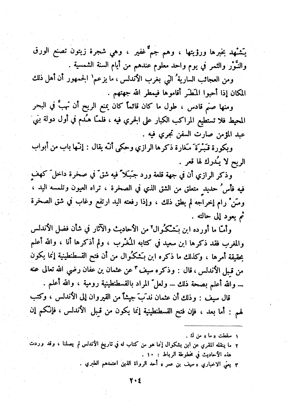 وأمّا ما أورده ابن بشكوال (2) من الأحاديث والآثار في شأن فضل الأندلس والمغرب فقد ذكرها ابن سعيد في كتابه المغرب، ولم أذكرها أنا، والله أعلم بحقيقة أمرها، وكذلك ما ذكره ابن بشكوال من أن فتح القسطنطينية إنما يكون من قبل الأندلس، قال: وذكره (3) سيف عن عثمان بن عفان رضي الله تعالى عنه - والله أعم بصحة ذلك - ولعلّ المراد بالقسطنطينية رومية، والله أعلم.