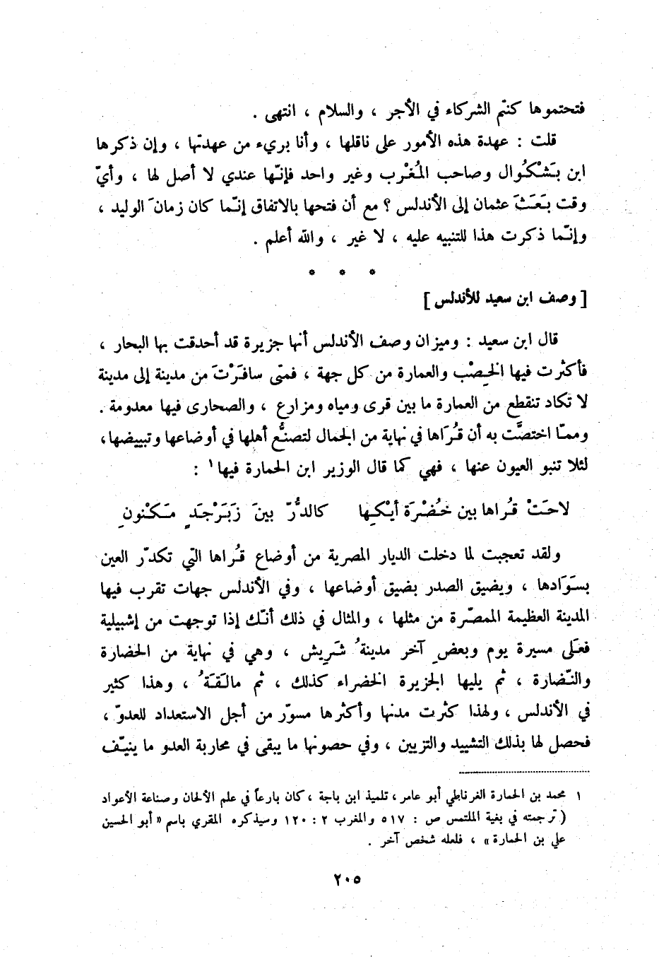 قال ابن سعيد: وميزان وصف الأندلس أنها جزيرة قد أحدقت بها البحار، فأكثرت فيها الخصب والعمارة من كل جهة، فمتى سافرت من مدينة إلى مدينة لا تكاد تنقطع من العمارة ما بين قرى ومياه ومزارع، والصحارى فيها معدومة. وممّا اختصّت به أن قراها في نهاية من الجمال لتصنّع أهلها في أوضاعها وتبييضها، لئلا تنبوالعيون عنها، فهي كما قال الوزير ابن الحمارة فيها (1) :