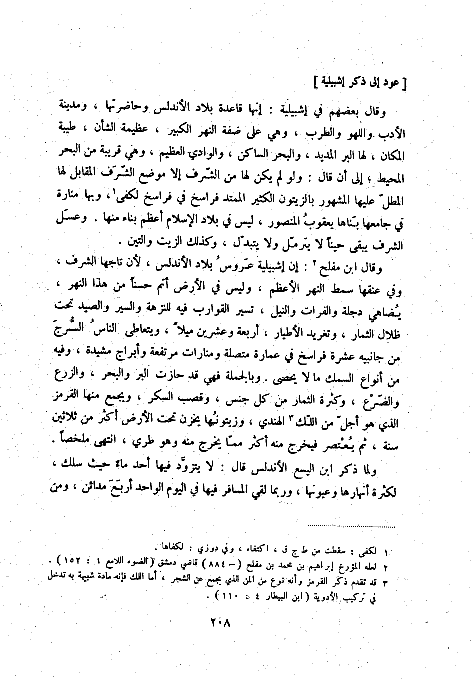 وقال ابن مفلح (2) : إن إشبيلية عروس بلاد الأندلس، لأن تاجها الشرف، وفي عنقها سمط النهر الأعظم، وليس في الأرض أتم حسناً من هذا النهر، يضاهي دجلة والفرات والنيل، تسير القوارب فيه للنزهة والسير والصيد تحت ظلال الثمار، وتغريد الأطيار، أربعة وعشرين ميلاً، ويتعاطى الناس السّرج من جانبيه عشرة فراسخ في عمارة متصلة ومنارات مرتفعة وأبراج مشيدة، وفيه من أنواع السمك ما لا يحصى. وبالجملة فهي قد حازت البر والبحر، والزرع والضّرع، وكثرة الثمار من كل جنس، وقصب السكر، ويجمع منها القرمز الذي هو أجلّ من اللّك (3) الهندي، وزيتونها نخزن تحت الأرض أكثر من ثلاثين سنة، فيخرج منه أكثر ممّا يخرج منه وهو طري، انتهى ملخصاً.