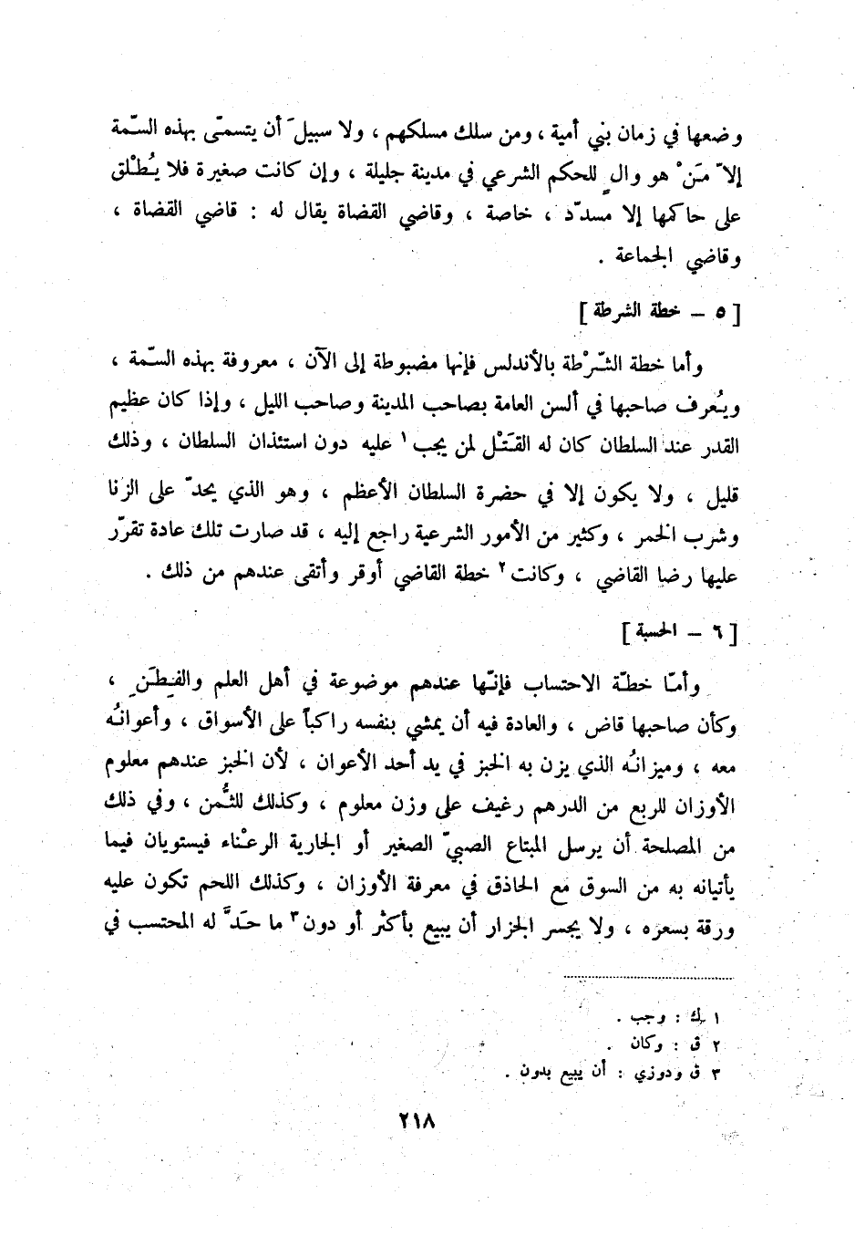 وأمّا خطّة الاحتساب فإنّها عندهم موضوعة في أهل العلم والفطن، وكأن صاحبها قاض، والعدة فيه أن يمشي بنفسه راكباً على الأسواق، وأعوانه معه، وميزانه الذي يزن به الخبز في يد أحد الأعوان، لأن الخبز عندهم معلوم الأوزان للربع من الدرهم رغيف على وزن معلوم، وكذلك للثّمن، وفي ذلك من المصلحة أن يرسل المبتاع الصبيّ الصغير أو الجارية الرعناء فيستويان فيما يأتيانه به من السوق مع الحاذق في معرفة الأوزان، وكذلك اللحم تكون عليه ورقة بسعره، ولا يجسر الجزار أن يبيع بأكثر من دون (3) ما حدّ له المحتسب في