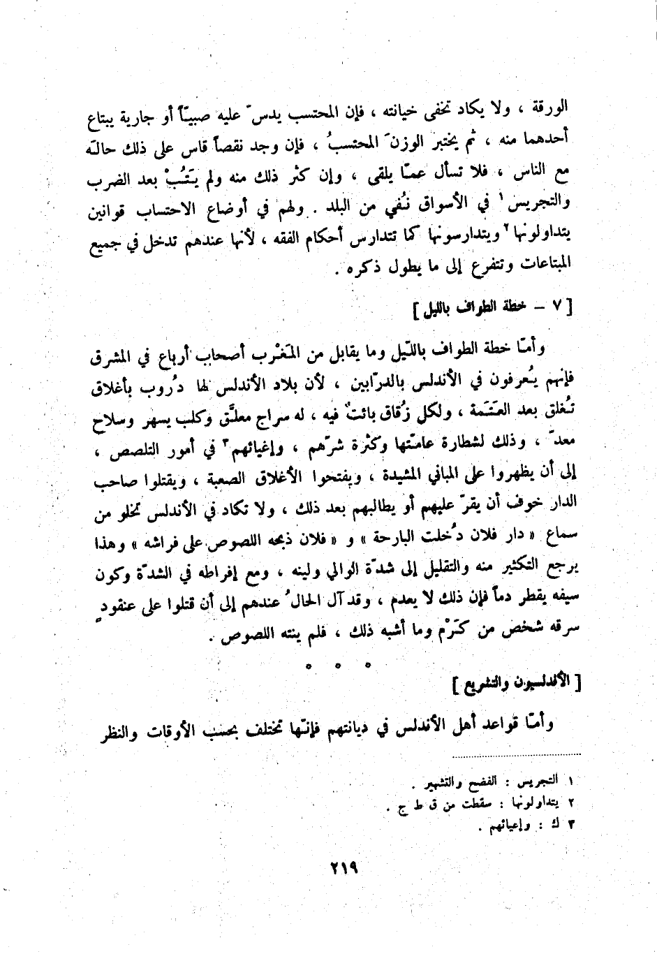 وأمّا خطة الطواف باللّيل وما يقابل من المغرب أصحاب أرباع في المشرق فإنهم يعرفون في الأندلس بالدرّابين، لأن بلاد الأندلس لها دروب بأغلاق تغلق بعد العتمة، ولكل زقاق بائت فيه، له سراجٌ معلّق وكلب يسهر وسلاح معدّ، وذلك لشطارة عامّتها وكثرة شرّهم، وإغيائهم (3) في أمور التلصص، إلى أن يظهروا على المباني المشيدة، ويفتحوا الأغلاق الصعبة، ويقتلوا صاحب الدار خوف أن يقرّ عليهم أو يطالبهم بعد ذلك، ولا تكاد في الأندلس تخلو من سماع دار فلان دخلت البارحة وفلان ذبحه اللصوص على فراشه وهذا يرجع التكثير منه والتقليل إلى شدّة الوالي ولينه، ومع إفراطه في الشدّة وكون سيفه يقطر دماً فإن ذلك يعدم، وقد آل الحال عندهم إلى أن قتلوا على عنقودٍ سرقه شخص من كرم وما أشبه ذلك، فلم ينته اللصوص.