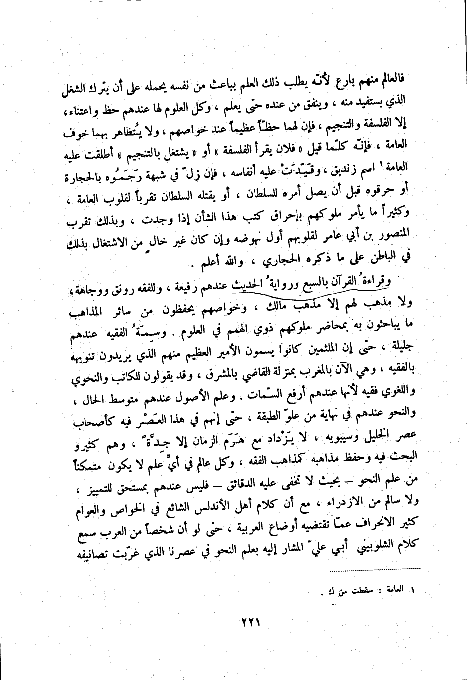 فالعالم منهم بارع لأنّه يطلب ذلك العلم بباعث من نفسه يحمله على أن يترك الشغل الذي يستفيد منه، وينفق من عنده حتى يعلم، وكل العلوم لها عندهم حظ واعتناء، إلا الفلسفة والتنجيم، فإن لهما حظّاً عظيماً عند خواصهم، ولا يتظاهر بهما خوف العامة، فإنّه كلّما قيل فلان يقرأ الفلسفة أو يشتغل بالتنجيم أطلقت عليه العامة (1) اسم زنديق، وقيدت عليه أنفاسه، فإن زلّ في شبهة رجموه بالحجارة أو حرقوه قبل أن يصل أمره للسلطان، أو يقتله السلطان تقرباً لقلوب العامة، وكثيراً ما يأمر ملوكهم بإحراق كتب هذا الشأن إذا وجدة، وبذلك تقرب المنصور بن أبي عامر لقلوبهم أول نهوضه وإن كان غير خالٍ من الاشتغال بذلك في الباطن على ما ذكره الحجاري، الله أعلم.
