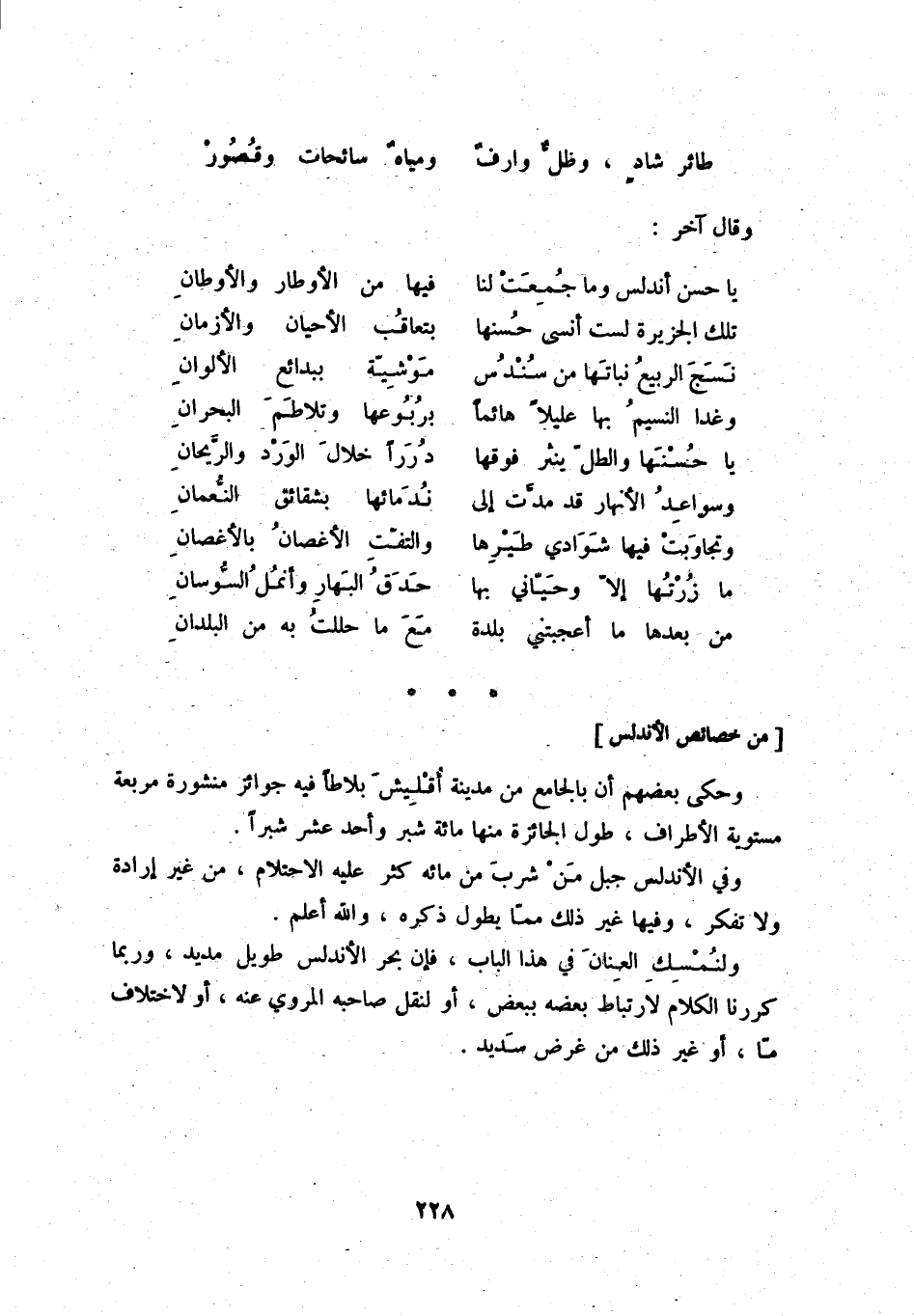 طائرٌ شادٍ، وظلٌّ وارفٌ ... ومياهٌ سائحاتٌ وقصور وقال آخر: