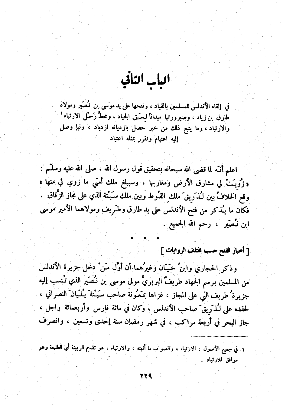 اعلم أنّه لما قضى الله سبحانه بتحقيق قول رسول الله، صلى الله عليه وسلّم: " زويت لي مشارق الأرض ومغاربها، وسيبلغ ملك أمتي ما زوي لي منها " وقع الخلاف بين لذريق ملك القوط وبين ملك سبتة الذي على مجاز الزّقاق، فكان ما يذكر من فتح الأندلس على يد طارق وطريف ومولاهما الأمير موسى ابن نصير، رحم الله الجميع.