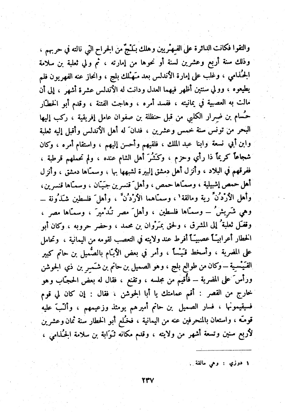 والتقوا فكانت الدائرة على الفهريين وهلك بلجٌ من الجراح التي نالته في حربهم، وذلك سنة أربع وعشرين لسنة أو نحوها من إمارته، ثم ولي ثعلبة بن سلامة الجذامي، وغلب على إمارة الأندلس بعد مهلك بلج، وانحاز عنه الفهريون فلم يطيعوه، وولي سنتين أظهر فيهما العدل ودانت له الأندلس عشرة أشهر، إلى أن مالت به العصبية في يمانيته، ففسد أمره، وهاجت الفتنة، وقدم أبو الخطّار حسام بن ضرار الكلبي من قبل حنظلة بن صفوان عامل إفريقية، ركب إليها البحر من تونس سنة خمس وعشرين، فدان له أهل الأندلس وأقبل إليه ثعلبة وابن أبي نسعة وابنا عبد الملك، فلقيهم وأحسن إليهم، واستقام أمره، وكان شجاعاً كريماً ذا رأيٍ وحزمٍ، وكثر أهل الشام عنده، ولم تحملهم قرطبة ففرقهم في البلاد، وأنزل أهل دمشق إلبيرة لشبهها بها، وسمّاها دمشق، وأنزل أهل حمص إشبيلية، وسمّاها حمص، وأهل قنسرين جيّان، وسمّاها قنسرين، وأهل الأردنّ رية ومالقة (1) ، وسمّاهما الأردنّ، وأهل فلسطين شذونة - وهي شريش - وسمّاها فلسطين، وأهل مصر تدمير، وسمّاها مصر، وقفل ثعلبة إلى المشرق، ولحق بمروان بن محمد، وحضر حروبه، وكان أبو الخطار أعرابيّاً عصبيّاً أفرط عند ولايته في التعصب لقومه من اليمانية، وتحامل على المضرية، وأسخط قيساً، وأمر في بعض الأيّام بالصّميل بن حاتم كبير القيسية - وكان من طوالع بلج، وهو الصميل بن حاتم بن شمر بن ذي الجوشن ورأس على المضرية - فأقيم من مجلسه، وتقنع، فقال له بعض الحجّاب وهو خارج من القصر: أقم عمامتك يا أبا الجوشن، فقال: إن كان لي قوم فسيقيمونها، فسار الصميل بن حاتم أميرهم يومئذٍ وزعيمهم، وألّب عليه قومه، واستعان بالمنحرفين عنه من اليمانية، فخلع أبو الخطار سنة ثمانٍ وعشرين لأربع سنين وتسعة أشهر من ولايته، وقدم مكانه ثوابة بن سلامة الجذامي،