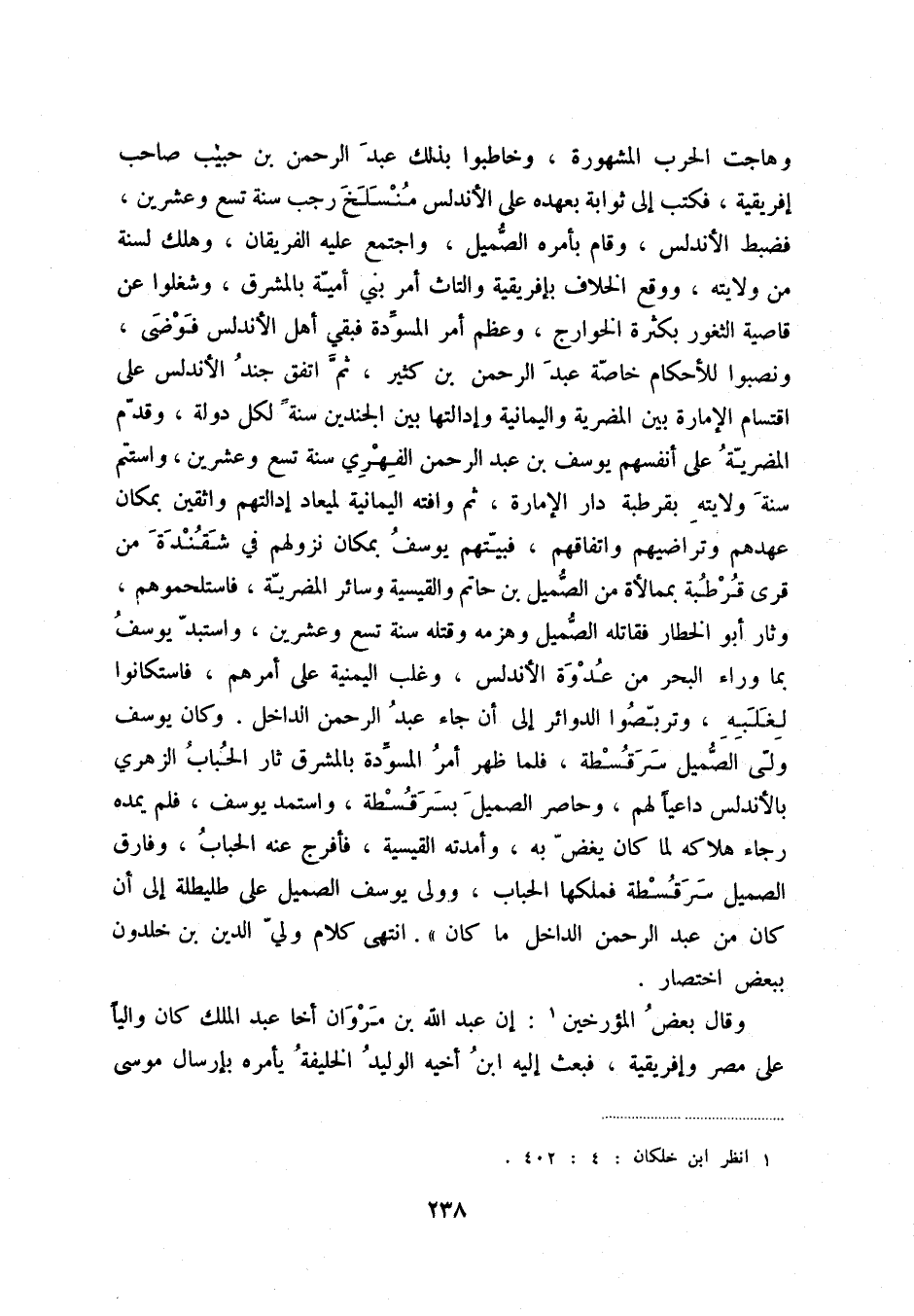 وهاجت الحرب المشهورة، وخاطبوا بذلك عبد الحمن بن حبيب صاحب إفريقية، فكتب إلى ثوابة بعهده على الأندلس منسلخ رجب سنة تسع وعشرين فضبط الأندلس، وقام بأمره الصّميل، واجتمع عليه الفريقان، وهلك لسنة من ولايته، ووقع الخلاف بإفريقية والتاث أمر بني أميّة بالمشرق، وشغلوا عن قاصية الثغور بكثرة الخوارج، وعظم أمر المسوّدة فبقي أهل الأندلس فوضى، ونصبوا للأحكام خاصّة عبد الرحمن بن كثير، ثمّ اتفق جند الأندلس على اقتسام الإمارة بين المضرية واليمانية وإدالتها بين الجندين سنةً لكل دولة، وقدّم المضريّة على أنفسهم يوسف بن عبد الرحمن الفهري سنة تسعٍ وعشرين، واستتم سنة ولايته بقرطبة دار الإمارة، ثم وافته اليمانية لميعاد إدالتهم واثقين بمكان عهدهم وتراضيهم واتفاقهم، فبيّتهم يوسف بمكان نزولهم في شقندة من قرى قرطبة بممالأة من الصّميل بن حاتم والقيسية وسائر المضريّة، فاستلحموهم، وثار أبو الخطار فقاتله الصّميل وهزمه وقتله سنة تسعٍ وعشرين، واستبدّ يوسف بما وراء البحر من عدوة الأندلس، وغلب اليمنية على أمرهم، فاستكانوا لغلبه، وتربّصوا الدوائر إلى أن جاء عبد الرحمن الداخل. وكان يوسف ولّى الصّميل سرقسطة، فلما ظهر أمر المسوّدة بالمشرق ثار الحباب الزهري بالأندلس داعياً لهم، وحاصر الصّميل بسرقسطة، واستمد يوسف، فلم يمده رجاء هلاكه لما كان يغضّ به، وأمدته القيسية، فأفرج عنه الحباب، وفارق الصميل سرقسطة فملكها الحباب، وولى يوسف الصميل على طليطلة إلى أن كان من عبد الرحمن الداخل ما كان. انتهى كلام وليّ الدين بن خلدون ببعض اختصار.