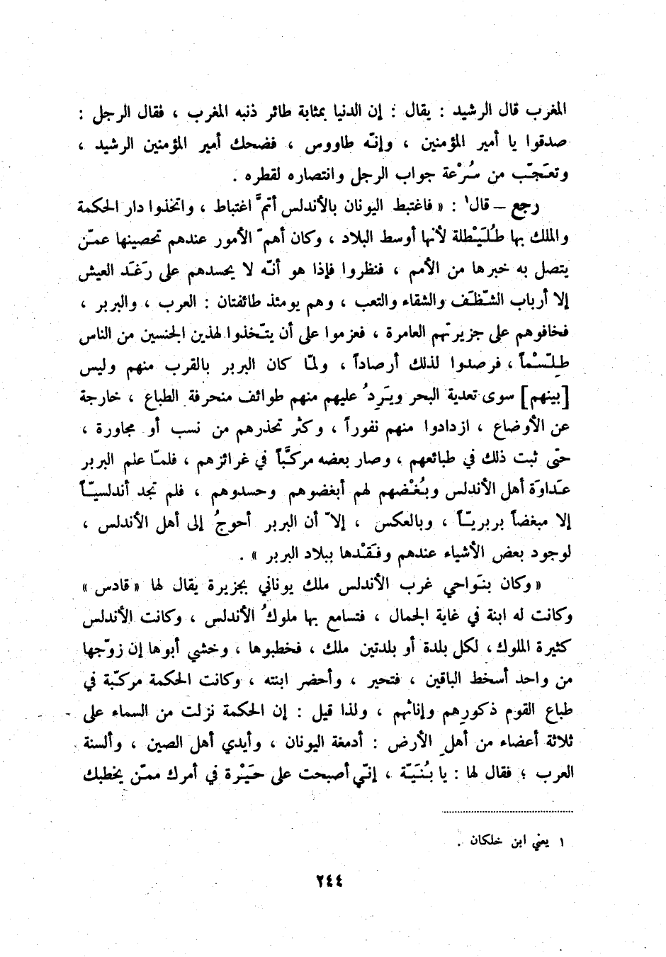 رجع - قال (1) : " فاغتبط اليونان بالأندلس أتمّ اغتباط، واتخذوا دار الحكمة والملك بها طليطلة لأنها أوسط البلاد، وكان أهمّ الأمور عندهم تحصينها عمّن يتصل به خبرها من الأمم، فنظروا فإذا هو أنّه لا يحسدهم على بغد العيش إلا أرباب الشّظف والشقاء والتعب، وهم يومئذ طائفتان: العرب، والبربر، فخافوهم على جزيرتهم العامرة، فعزموا على أن يتّخذوا لهذين الجنسين من الناس طلّسماً، فرصدوا لذلك أرصاداً، ولمّا كان البربر بالقرب منهم وليس [بينهم] سوى تعدية البحر ويرد عليهم منهم طوائف منحرفة الطباع، خارجة عن الأوضاع، ازدادوا منهم نفوراً، وكثر تحذرهم من نسب أو مجاورة، حتى ثبت ذلك في طبائعهم، وصار بعضه مركّباً في غرائزهم، فلمّا علم البربر عداوة أهل الأندلس وبغضهم لهم أبغضوهم وحسدوهم، فلم تجد أندلسيّاً إلا مبغضاً بربريّاً، وبالعكس، إلاّ أن البربر أحوج إلى أهل الأندلس، لوجود بعض الأشياء عندهم وفقدها بلاد البربر ".