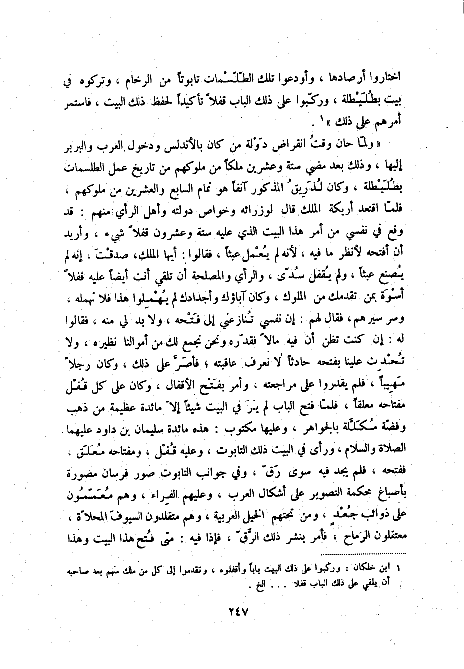 ولمّا حان وقت انقراض دولة من كان بالأندلس ودخول العرب والبربر إليها، وذلك بعد مضي ستة وعشرين ملكاً من ملوكهم من تاريخ عمل الطلسمات بطليطلة، وكان لذريق المذكور آنفاً هو تمام السابع والعشرين من ملوكهم، فلمّا اقتعد أريكة الملك قال لوزرائه وخواص دولته وأهل الرأي منهم: قد وقع في نفسي من أمر هذا البيت الذي عليه ستة وعشرون قفلاً شيء، وأريد أن أفتحه لأنظر ما فيه، لأنه لم يعمل عبثاً، فقالوا: أيها الملك، صدقت، إنه م يصنع عبثاً، ولم يقفل سدىً، والرأي والمصلحة أن تلقي أنت أيضاً عليه قفلاً أسوة بمن تقدمك من الملوك، وكان آباؤك وأجدادك لم يهملوا هذا فلا تهمله، وسر سيرهم، فقال لهم: إن نفسي تنازعني إلى فتحه، ولا بد لي منه، فقالوا له: إن كنت تظن أن فيه مالاً فقدّره ونحن نجمع لك من أموالنا نظيره، ولا تحدث علينا بفتحه حادثاً لا تعرف عاقبته؛ فأصرّ على ذلك، وكان رجلاً مهيباً، فلم يقدروا على مراجعته، وأمر بفتح الأقفال، وكان على كل قفل مفتاحه معلقاً، فلمّا فتح الباب لم ير في البيت شيئاً إلاّ مائدة عظيمة من ذهبٍ وفضةٍ مكلّلةٍ بالجواهر، وعليها مكتوب: هذه مائدة سليمان بن داود عليهما الصلاة والسلام، ورأى في البيت ذلك التابوت، وعليه قفل، ومفتاحه معلّق، ففتحه، فلم يجد فيه سوى رقّ، وفي جوانب التابوت صور فرسان مصورة بأصباغ محكمة التصوير على أشكال العرب، وعليهم الفراء، وهم معمّمون على ذوائب جعدٍ، ومن تحتهم الخيل العربية، وهم متقلدون السيوف المحلاّة، معتقلون الرماح، فأمر بنشر ذلك الرّقّ، فإذا فيه: متى فتح هذا البيت وهذا