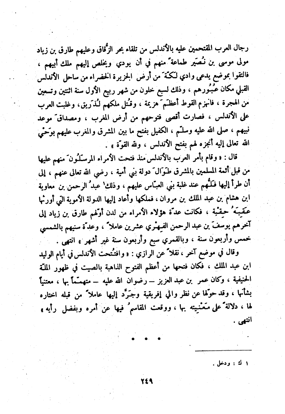 وقال في موضع آخر، نقلاً عن الرازي: وافتتحت الأندلس في أيام الوليد بن عبد الملك، فكان فتحها من أعظم الفتوح الذاهبة بالصيت في ظهور الملّة الحنيفية، وكان عمر بن عبد العزيز - رضوان الله عليه - متهمّماً بها، معتنياً بشأنها، وقد حوّلها عن نظر والي إفريقية وجرّد إليها عاملاً من قبله اختاره لها، دلالةً على معنيته بها، ووقعت المقاسم فيها عن أمره وبفضل رأيه انتهى.