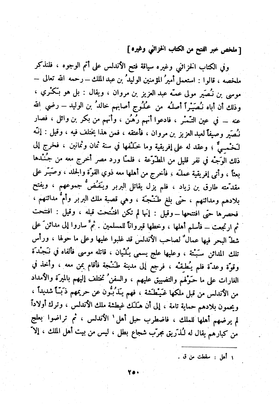 وفي الكتاب الخزائني وغيره سياقة فتح الأندلس على أتم الوجوه، فلنذكر ملخصه، قالوا: استعمل أمير المؤمنين الوليد بن عبد الملك - رحمه الله تعالى - موسى بن نصير مولى عمّه عبد العزيز بن مروان، ويقال: بل هو بكري، وذلك أن أباه نصيراً أصله من علوج أصابهم خالد بن الوليد - رضي الله عنه - في عين التّمر، فادعوا أنهم رهن، وأنهم من بكر بن وائل، فصار نصير وصيفاً لعبد العزيز بن مروان، فأعتقه، فمن هذا يختلف فيهن وقيل: إنّه لخميٌّ، وعقد له على إفريقية وما خلفها في سنة ثمان وثمانين، فخرج إلى ذلك الوجه في نفر قليل من المطّوّعة، فلمّا ورد مصر أخرج معه من جندها بعثاً، وأتى إفريقية عملهن فأخرج من أهلها معه ذوي القوّة والجلد، وصيّر على مقدّمته طارقبن زياد، فلم يزل يقاتل البربر ويفضّ جموعهم، ويفتح بلادهم ومدائنهم، حتى بلغ طنجة، وهي قصبة ملك البربر وأمّ مدائنهم، فحصرها حتى افتتحها - وقيل: إنها لم تكن افتتحت قبله، وقيل: افتتحت ثم ارتجعت - فأسلم أهلها، وخطها قيرواناً للمسلمين، ثمّ ساروا إلى مدائن على شطّ البحر فيها عمالٌ لصاحب الأندلس قد غلبوا عليها وعلى ما حولها، ورأس تلك المدائن سبتة، وعليها علج يسمى يليان، قاتله موسى فألفاه في نجدة وقوّة وعدّة فلم يطقه، فرجع إلى مدينة طنجة فأقام بمن معه، وأخذ في الغارات على ما حولهم والتضييق عليهم، والسفن تختلف إليهم بالميرة والأمداد من الأندلس من قبل ملكها غيطشة، فهم يذبّون عن جريمهم ذبّاً شديداً، ويحمون بلادهم حماية تامة، إلى أن هلك غيطشة ملك الأندلس، وترك أولاداً لم يرضهم أهلها للملك، فاضطرب حبل أهل (1) الأندلس، ثم تراضوا بعلج من كبارهم يقال له لذريق مجرّب شجاع بطل، ليس من بيت أهل الملك، إلاّ