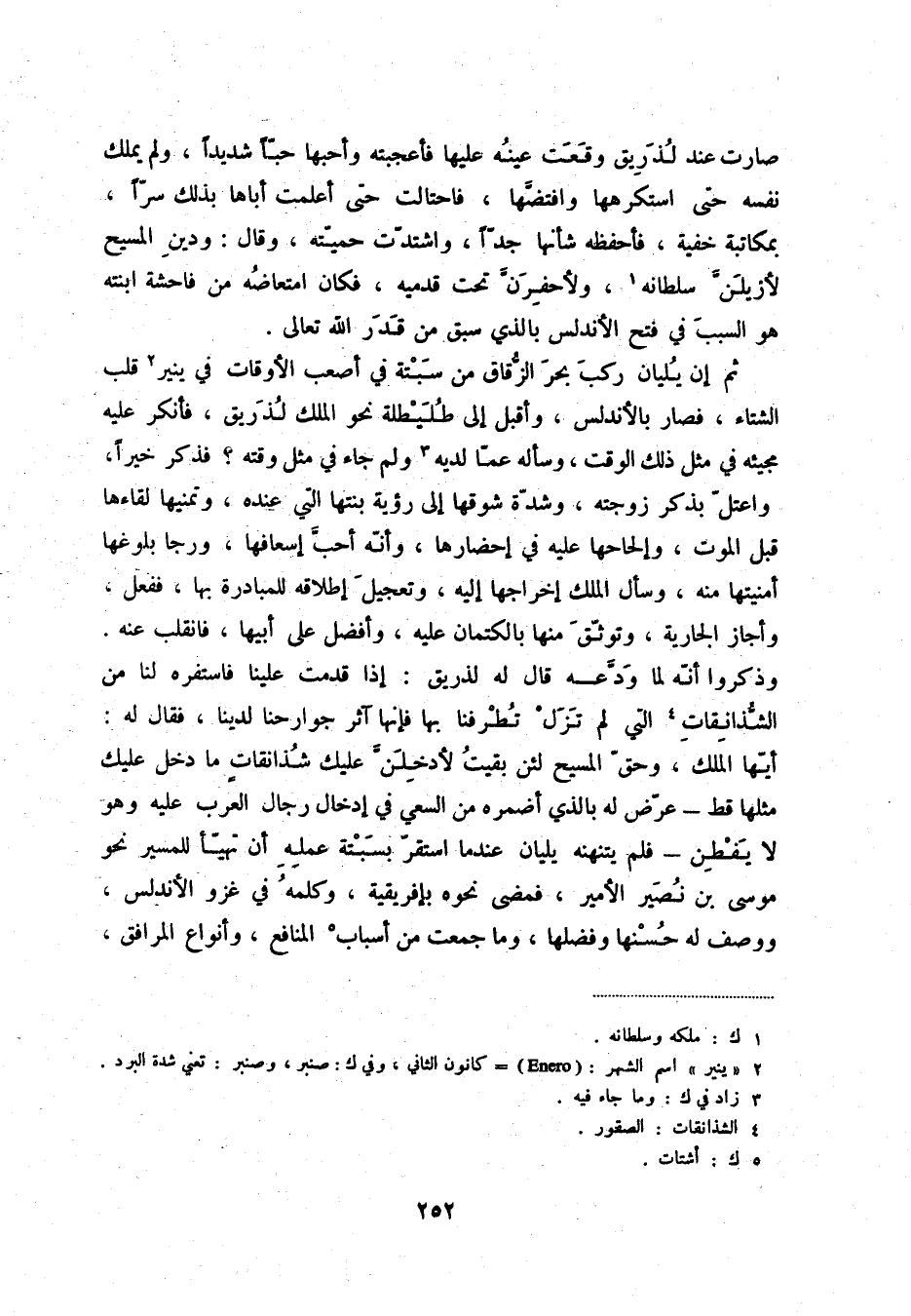 ثم إن يليان ركب بحر الزّقاق من سبتة في أصعب الأوقات في ينير (2) قلب الشتاء، فصار بالأندلس، وأقبل إلى طليطلة نحو الملك لذريق، فأنكر عليه مجيئه في مثل ذلك الوقت، وسأله عمّا لديه (3) ولم جاء في مثل وقته؟ فذكر خيراً، واعتلّ بذر زوجته، وشدّة شوقها إلى رؤية بنتها التي عنده، وتمنيها لقاءها قبل الموت، وإلحاحها عليه في إحضارها، وأنّه أحبّ إسعافها، ورجا بلوغها أمنيتها منه، وسأل الملك إخراجها إليه، وتجيل إطلاقه للمبادرة بها، ففعل، وأجاز الجارية، وتوثّق منها الكتمان عليه، وأفضل على أبيها، فانقلب عنه. وذكوا أنّه لما ودّعه قال له لذريق: إذا قدمت علينا فاستفره لنا من الشّذانقات (4) التي لم تزل تطرفنا بها فإنها آثر جوارحنا لدينا، فقال له: أيّها املك، وحقّ المسيح لئن بقيت لأدخلنّ عليك شذانقاتٍ ما دخل عليك مثلها قط؟ عرّض له بالذي أضمره من السعي في إدخال رجال العرب عليه وهو لا يفطن؟ فلم يتنهنه يليان عندما استقرّ بسبتة عمله أن تهيّأ للمسير نحو موسى بن نصير الأمير، فمضى نحوه بإفريقية، وكلمه في غزو الأندلس، ووصف له حسنها وفضلها، وما جمعت من أسباب (5) المنافع، وأنواع المرافق،