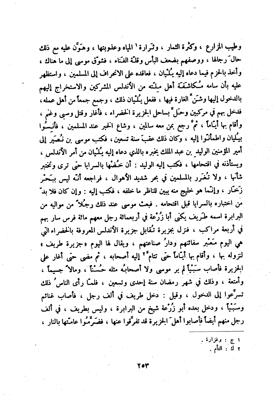 وطيب المزارع، وكثرة الثمار، وثرارة (1) المياه وعذوبتها، وهوّن عليه مع ذلك حال رجالها، ووصفهم بضعف البأس وقلّة الغناء، فشوّق موسى إلى ما هناك، وأخذ بالحزم فيما دعاه إليه يليان، فعاقده على الانحراف إلى المسلمين، واستظهر عليه بأن سامه مكاشفة أهل ملّته من الأندلس المشركين والاستخراج إليهم بالدخول إليها وشنّ الغارة فيها، ففعل يليان ذلك، وجمع جمعاً من أهل عمله، فدخل بهم في مركبين وحلّ بساحل الجزيرة الخضراء، فأغار وقتل وسبى وغنم، وأقام بها أيّاماً، ثمّ رجع بمن معه سالمين، وشاع الخبر عند المسلمين، فأنسوا بيليان واطمأنّوا إليه، وكان ذلك عقب سنة تسعين، فكتب موسى بن نصير إلى أمير المؤمنين الوليد بن عبد الملك يخبره بالذي دعاه إليه يليان من أمر الأندلس، ويستأذنه في اقتحامها، فكتب إليه الوليد: أن خضها بالسرايا حتى ترى وتختبر شأنها، ولا تغرر بالمسلمين في بحر شديد الأهوال، فراجعه أنّه ليس ببحر زخّار، وإنّما هو خليج منه يبين للناظر ما خلفه، فكتب إليه: وإن كان فلابدّ من اختباره بالسرايا قبل اقتحامه. فبعث موسى عند ذلك رجلاً من مواليه من البرابرة اسمه طريف يكنى أبا زرعة في أربعمائة رجل معهم مائة فرس سار بهم في أربعة مراكب، فنزل بجزيرة تقابل جزيرة الأندلس المعروفة بالخضراء التي هي اليوم معبر سفائنهم ودار صناعتهم، ويقال لها اليوم جزيرة طريف لنزوله بها، وأقام بها أيّاماً حتى تتامّ (2) إليه أصحابه، ثم مضى حتى أغار على الجزيرة فأصاب سبياً لم ير موسى ولا أصحابه مثله حسناً، ومالاً جسيماً، وأمتعة، وذلك في شهر رمضان سنة إحدى وتسعين، فلمّا رأى الناس ذلك تسرّعوا إلى الدخول، وقيل: دخل طريف في ألف رجل، فأصاب غنائم وسبياً، ودخل بعده أبو زرعة شيخ من البرابرة، وليس بطريف، في ألف رجل منهم أيضاً فأصابوا أهل الجزيرة قد تفرّقوا عنها، فضرّموا عامّتها بالنار،