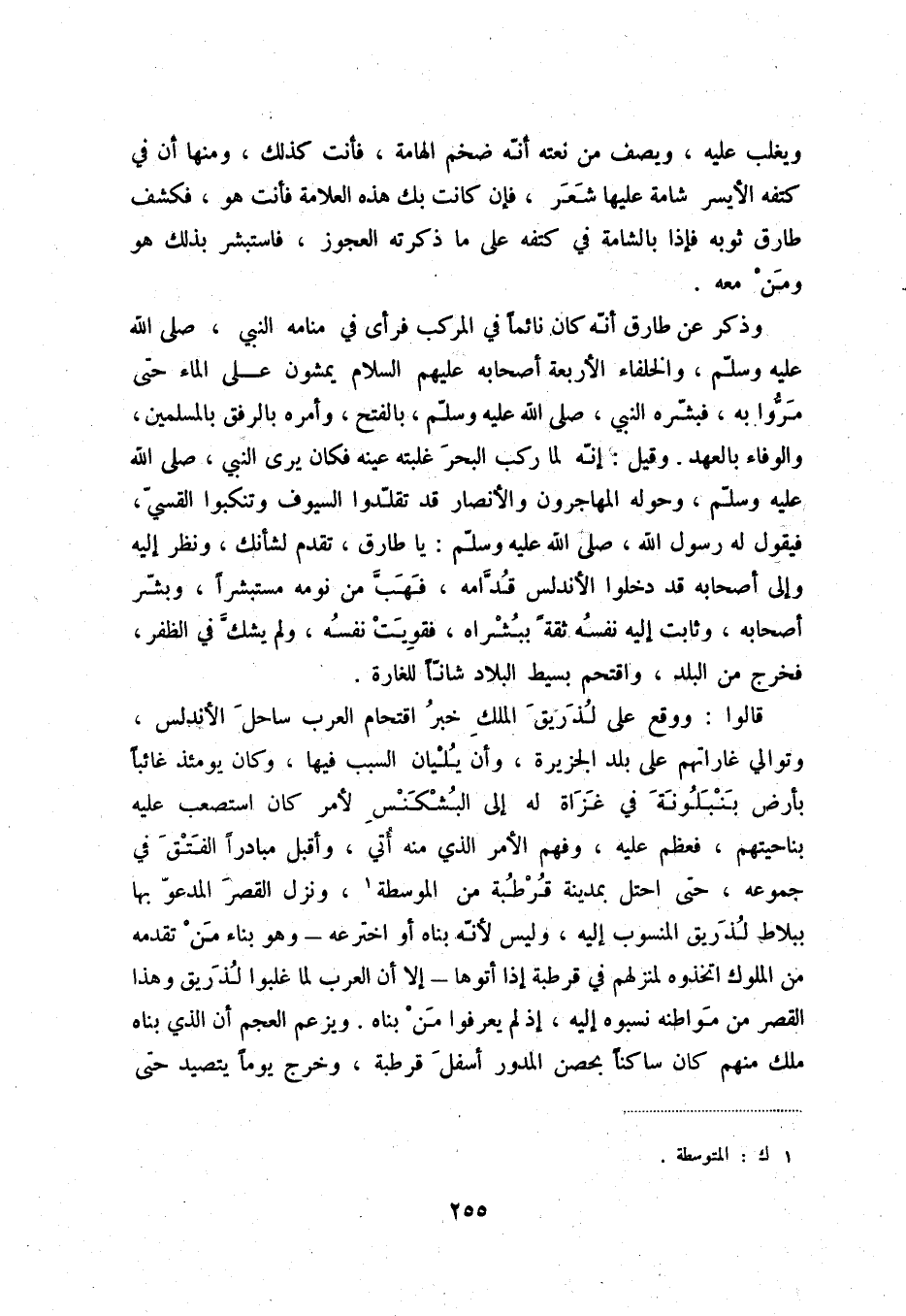 ويغلب عليه، ويصف من نعته أنّه ضخم الهامة، فأنت كذلك، ومنها أن في كتفه الأيسر شامة عليها شعر، فإن كان بك هذه العلامة فأنت هو، فكشف طارق ثوبه فإذا بالشامة في كتفه على ما ذكرته العجوز، فاستبشر بذلك هو ومن معه.