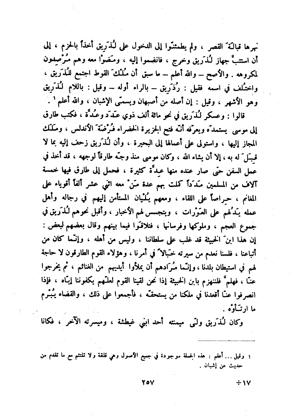 نهرها قبالة القصر، ولم يطمئنّوا إلى الدخول على لذريق أخذاً بالحزم، إلى أن استتبّ جهاز لذريق وخرج، فانضموا إليه، ومضوا معه وهم مرصدون لمكروهه. والأصح - والله أعلم - ما سبق أن ملك القوط اجتمع للذريق، واختلف في اسمه فقيل: رذريق - بالراء أوله - وقيل: باللام لذريق وهو الأشهر، وقيل: إن أصله من أصبهان ويسمّى الإشبان، والله أعلم (1) .