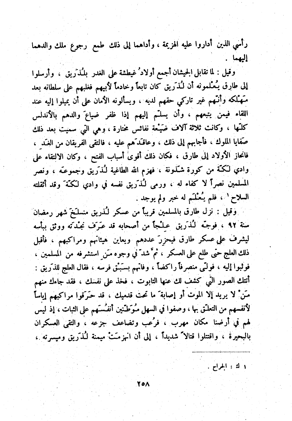 وقيل: لما تقابل الجيشان أجمع أولاد غيطشة على الغدر بلذريق، وأرسلوا إلى طارق يعلمونه أن لذريق كان تابعاً وخادماً لأبيهم فغلبهم على سلطانه بعد مهلكه وأنّهم غير تاركي حقهم لديه، ويسألونه الأمان على أني يميلوا إليه عند اللقاء فيمن يتبعهم، وأن يسلّم إليهم إذا ظفر ضياع والدهم بالأندلس كلّها، وكانت ثلاثة آلاف ضيعة نفائس مختارة، وهي التي سميت بعد ذلك صفايا الملوك، فأجابهم إلى ذلك، وعاقدهم عليه، فالتقى الفريقان من الغد، فانحاز الأولاد إلى طارق، فكان ذلك أقوى أسباب الفتح، وكان الالتقاء على وادي لكّة من كورة شذونة، فهزم الله الطاغية لذريق وجموعه، ونصر المسلمين نصراً لا كفاء له، ورمى لذريق نفسه في وادي لكّة وقد أثقلته السلاح (1) ، فلم يعلم له خبر ولم يوجد.