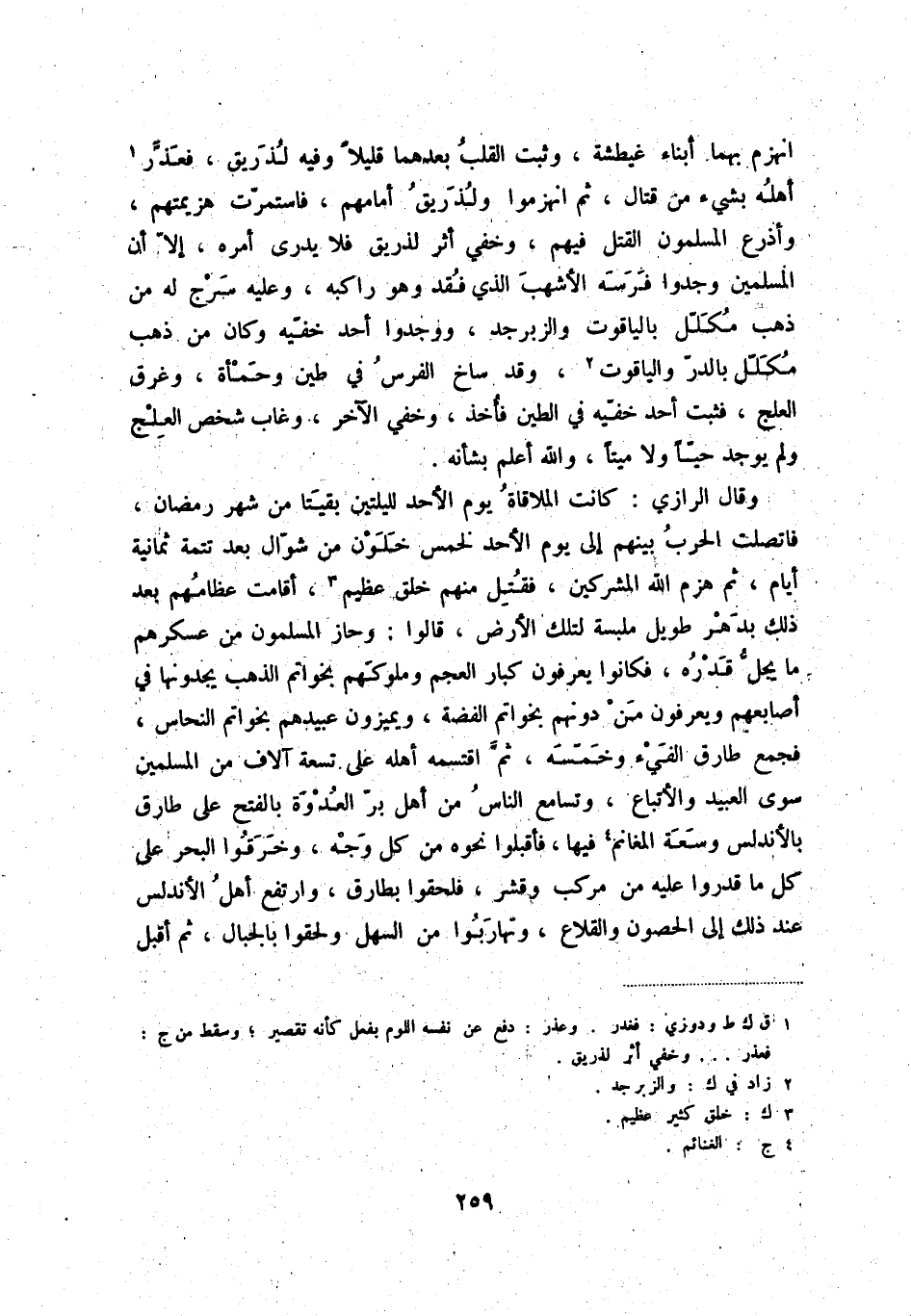 وقال الرازي: كانت الملاقاة يوم الأحد لليلتين بقيتا من شهر رمضان، فاتصلت الحرب بينهم إلى يوم الأحد لخمس خلون من شوّال بعد تتمة ثمانية أيام، ثم هزم الله المشركين، فقتل منهم خلق عظيم (3) ، أقامت عظامهم بعد ذلك بدهر طويل ملبسة لتلك الأرض، قالوا: وحاز المسلمون من عسكرهم ما يجلّ قدره، فكانوا يعرفون كبار العجم وملوكهم بخواتم الذهب يجدونها في أصابعهم ويعرفون من دونهم بخواتم الفضة، ويميزون عبيدهم بخواتم النحاس، فجمع طارق الفيء وخمّسه، ثمّ اقتسمه أهله على تسعى آلاف من المسلمين سوى العبيد والأتباع، وتسامع الناس من أهل برّ العدوة بالفتح على طارق بالأندلس وسعة المغنم (4) فيها، فأقبلوا نحوه من كل وجه، وخرقوا البحر على كل ما قدروا عليه من مركب وقشر، فلحقوا بطارق، وارتفع أهل الأندلس عند ذلك إلى الحصون والقلاع، وتهاربوا من السهل ولحقوا بالجبال، ثم أقبل