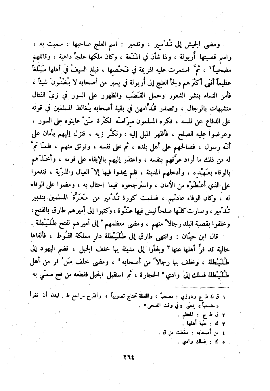 ومضى الجيش إلى تدمير، وتدمير: اسم العلج صاحبها، سميت به، واسم قصبتها أريولة، ولها شأن في المنعة، وكان ملكها علجاً داهية، وقاتلهم مضحياً (1) ، ثمّ استمرت عليه الهزيمة في فحصها، فبلغ السيف في أهلها مبلغاً عظيماً أفنى أكثرهم ولجأ العلج إلى أريولة في يسير من أصحابه لا يغنون شيئاً، فأمر النساء بنشر الشعور وحمل القصب والظهور على السور في زيّ القتال متشبهات بالرجال، وتصدر قدّامهن في بقية أصحابه يغالط المسلمين في قوته على الدفاع عن نفسه، فكره المسلمون مراسه لكثرة من عاينوه على السور، وعرضوا عليه الصلح، فأظهر الميل إليه، ونكّر زيه، فنزل إليهم بأمان على أنّه رسول، فصالحهم على أهل بلده، ثمّ على نفسه، وتوثق منهم، فلمّا تمّ له من ذلك ما أراد عرّفهم بنفسه، واعتذر إليهم بالإبقاء على قومه، وأخذهم بالوفاء بعهده، وأدخلهم المدينة، فلم يجدوا فيها إلاّ العيال والذرّية، فندموا على الذي أعطوه من الأمان، واسترجحوه فيما احتال به، ومضوا على الوفاء له، وكان الوفاء عادتهم، فسلمت كورة تدمير من معرّة المسلمين بتدبير تدمير، وصارت كلّها صلحاً ليس فيها عنوة، وكتبوا إلى أميرهم طارق بالفتح، وخلفوا بقصبة البلد رجالاً منهم، ومضى معظمهم (2) إلى أميرهم لفتح طليطلة.