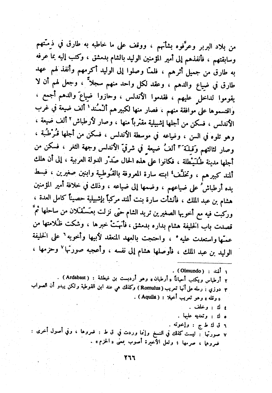 من بلاد البربر وعرّفوه بشأنهم، ووقف على ما خاطبه به طارق في ذمّتهم وسابقتهم، فأنفذهم إلى أمير المؤمنين الوليد بالشام بدمشق، وكتب إليه بما عرفه به طارق من جميل أثرهم، فلمّا وصلوا إلى الوليد أكرمهم وأنفذ لهم عهد طارق في ضياع والدهم، وعقد لكل واحد منهم سجلاًّ، وجعل لهم أن لا يقوموا لداخلٍ عليهم، فقدموا الأندلس، وحازوا ضياع والدهم أجمع، واقتسموها على موافقة منهم، فصار منهم لكبيرهم ألمند (1) ألف ضيعة في غرب الأندلس، فسكن من أجلها إشبيلية مقترباً منها، وصار لأرطباش (2) ألف ضيعة، وهو تلوه في السن، وضياعه في موسطة الأندلس، فسكن من أجلها قطرطبة، وصار لثالثهم وقلة (3) ألف ضيعة في شرقي الأندلس وجهة الثغر، فسكن من أجلها مدينة طليطلة، فكانوا على هذه الحال صدر الدولة العربية، إلى أن هلك ألمند كبيرهم، وتخّلف (4) ابنته سارة المعروفة بالقوطية وابنين صغيرين، فبسط يده أرطباش على ضياعهم، وضمها إلى ضياعه، وذلك في خلافة أمير المؤمنين هشام بن عبد الملك، فأنشأت سارة بنت ألمند مركباً بإشبيلية حصيناً كامل العدة، وركبت فيه مع أخويها الصغيرين تريد الشام حتى نزلت بعسقلان من ساحلها ثمّ قصدت باب الخليفة هشام بداره بدمشق، فأنهت خبرها، وشكت ظلامتها من عمّها واستعدت عليه (5) ، واحتجت بالعهد المنعقد لأبيها وأخويه (6) على الخليفة الوليد بن عبد الملك، فأوصلها هشام إلى نفسه، وأعجبه صورتها (7) وحزمها،