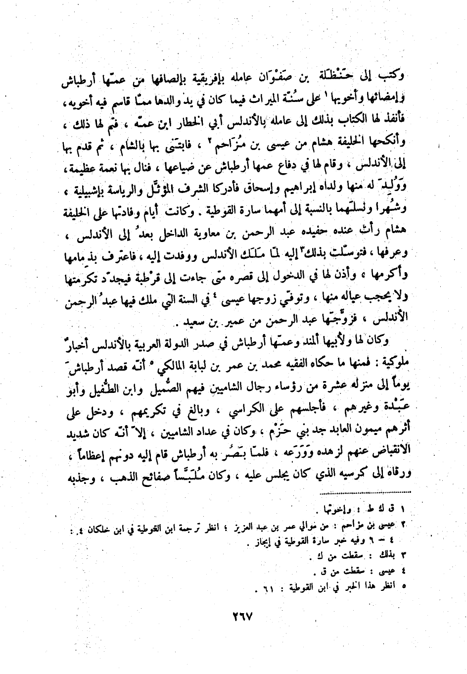وكتب إلى حنظلة بن صفوان عامله بإفريقية بإنصافها من عمّها أرطباش وإمضائها وأخويها (1) على سنّة الميراث فيما كان في يد والدها ممّا قاسم فيه أخويه، فأنفذ لها الكتاب بذلك إلى عامله بالأندلس أبي الخطار ابن عمّه، فتم لها ذلك وأنكحها الخليفة هشام من عيسى بن مزاحم (2) ، فابتنى بها بالشام، ثم قدم بها إلى الأندلس، وقام لها في دفاع عمها أرطباش عن ضياعها، فنال بها نعمة عظيمة، وولد له منها ولداه إبراهيم وإسحاق فأدركا الشرف المؤثّل والرياسة بإشبيلية، وشهرا ونسلهما بالنسبة إلى أمهما سارة القوطية. وكانت أيام وفادتها على الخليفة هشام رأت عنده حفيده عبد الرحمن بن معاوية الداخل بعد إلى الأندلس، وعرفها، فتوسّلت بذلك (3) إليه لمّا ملك الأندلس ووفدت إليه، فاعترف بذمامها وأكرمها، وأذن لها في الدخول إلى قصره متى جاءت إلى قرطبة فيجدّد تكرمتها ولا يحجب عياله منها، وتوفّي زوجها عيسى (4) في السنة التي ملك فيها عبد الرحمن الأندلس، فزوّجها عبد الرحمن من عمير بن سعيد.