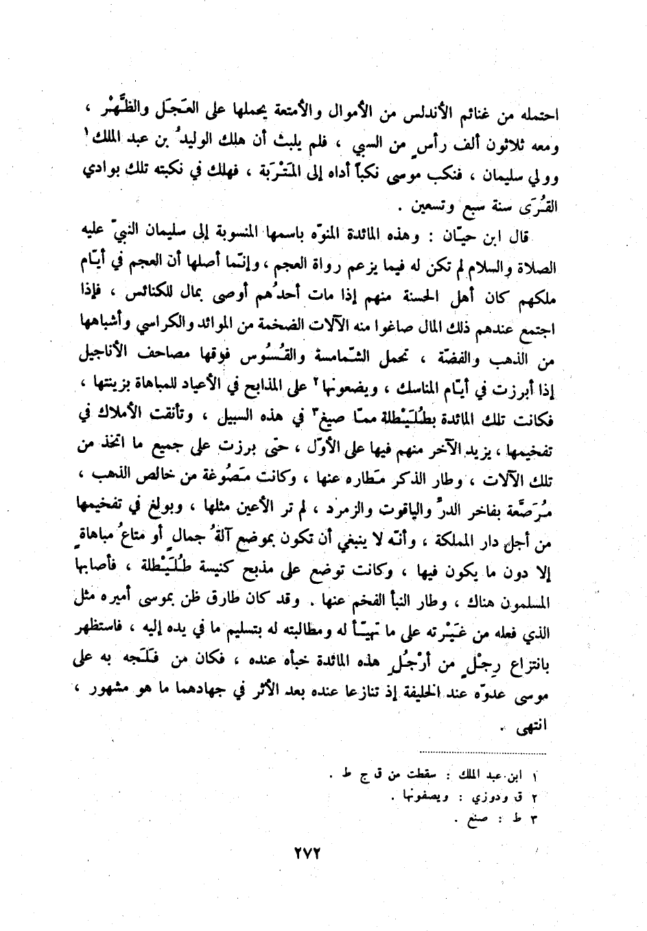 قال ابن حيّان: وهذه المائدة المنوّه باسمها المنسوبة إلى سليمان النبيّ عليه الصلاة والسلام لم تكن له فيما يزعم رواع العجم، وإنّما أصلها أن العجم في أيام ملكهم كان أهل الحسنة منهم إذا مات أحدهم أوصى بمال الكنائس، فإذا اجتمع عندهم ذلك المال صاغوا منه الآلات الضخمة من الموائد والكراسي وأشباهها من الذهب والفضّة، تحمل الشّمامسة والقسوس فوقها مصاحف الأناجيل إذا أبرزت في أيّام المناسك، ويضعونها (2) على المذابح في الأعياد للمباهاة بزينتها، فكانت تلك المائدة بطليطلة ممّا صيغ (3) في هذه السبيل، وتأنقت الأملاك في تفخيمها، يزيد الآخر منهم فيها على الأوّل، حتى برزت على جميع ما اتخذ من تلك الآلات، وطار الذكر مطاره عنها، وكانت مصوغة من خالص الذهب، مرصّعة بفاخر الدرّ والياقوت والزمرد، لم تر الأعين مثلها، وبولغ في تفخيمها من أجل دار المملكة، وأنّه لا ينبغي أن تكون بموضع آلة جمالٍ أو متاع مباهاةٍ إلا دون ما يكون فيها، وكانت توضع على مذبح كنيسة طليطلة، فأصابها المسلمون هناك، وطار النبأ الفخم عنها. وقد كان طارق ظن بموسى أميره مثل الذي فعله من غيرته على ما تهيّأ له ومطالبته له بتسليم ما في يده إليه، فاستظهر بانتزاع رجلٍ من أرجل هذه المائدة خبأه عنده، فكان من فلجه به على موسى عدوّه عند الخليفة إذ تنازعا عنده بعد الأثر في جهادهما ما هو مشهور، انتهى.