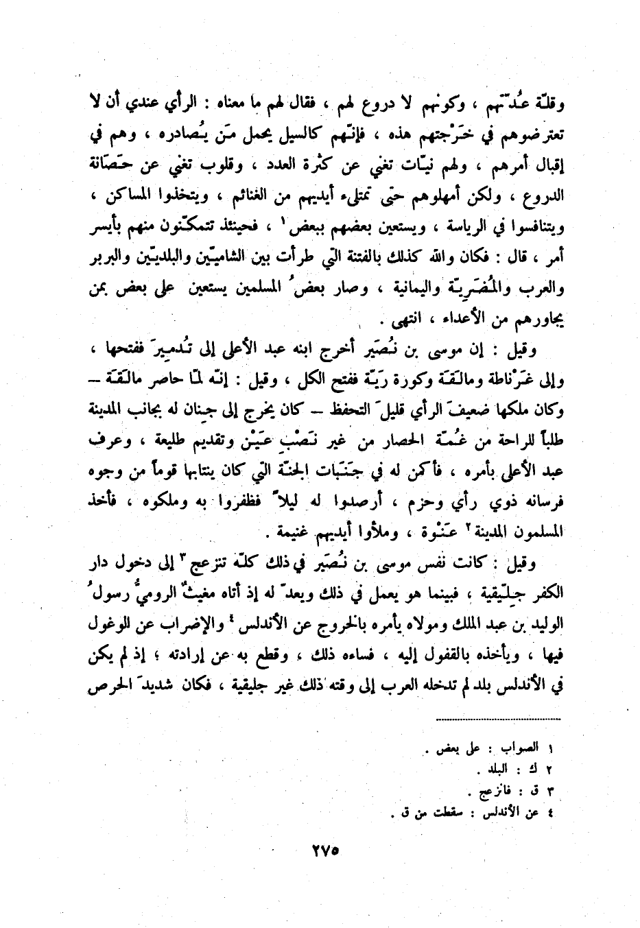 وقلّة عدّتهم، وكونهم لا دروع لهم، فقال لهم ما معناه: الرأي عندي أن لا تعترضوهم في خرجتهم هذه، فإنّهم كالسيل يحمل من يصادره، وهم إقبال أمرهم، ولهم نيّات تغني عن كثرة العدد، وقلوب تغني عن حصانة الدروع، ولكن أمهلوهم حتى تمتلئ أيديهم من الغنائم، ويتخذوا المساكن ويتنافسوا في الرياسة، ويستعين بعضهم ببعض (1) ، فحينئذ تتمكّنون منهم بأيسر أمر، قال: فكان والله كذلك بالفتنة التي طرأت بين الشاميّين والبلديّين والبربر والعرب والمضريّة واليمانية، وصار بعض المسلمين يستعين على بعض بمن يجاورهم من الأعداء، انتهى.