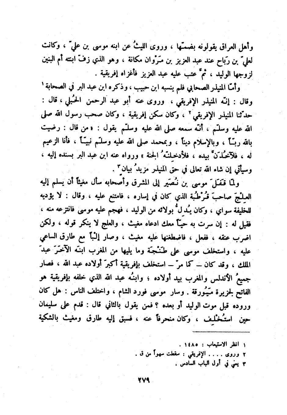 وأمّا المنيذر الإفريقي فلم ينسبه ابن حبيب، وذكره ابن عبد البر في الصحابة (1) وقال: إنّه المنيذر الإفريقي، وروى عنه أبو عبد الرحمن الحبلي، قال: حدّثنا المنيذر الإفريقي (2) ، وكان سكن إفريقية، وكان صحب رسول الله صلى الله عليه وسلّم، أنّه سمعه صلى الله عليه وسلّم يقول: " من قال: رضيت بالله ربّاً، وبالإسلام ديناً، وبمحمد صلى الله عليه وسلّم نبيّاً، فأنا الزعيم له، فلآخذنّ بيده، فلأدخلنّه الجنة " ورواه عنه ابن عبد البر بسنده إليه، وسيأتي إن شاء الله تعالى في حق المنيذر مزيد بيان (3) .