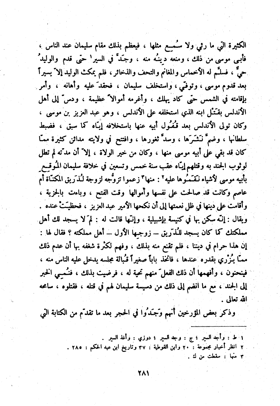 الكثيرة التي ما رئي ولا سمع مثلها، فيعظم بذلك مقام سليمان عند الناس، فأبى موسى من ذلك، ومنعه دينه منه، وجدّ في السير (1) حتى قدم والوليد حيٌّ، فسلّم له الأخماس والمغانم والتحف والذخائر، فلم يمكث الوليد إلاّ يسيراً بعد قدوم موسى، وتوفّي، واستخلف سليمان، فحقد عليه وأهانه، وأمر بإقامته في الشمس حتى كاد يهلك، وأغرمه أموالاً عظيمة، ودسّ إلى أهل الأندلس بقتل ابنه الذي استخلفه على الأندلس، وهو عبد العزيز بن موسى، وكان تولى الأندلس بعد قفول أبيه عنها باستخلافه إيّاه كما سبق، فضبط سلطانها، وضمّ نشرها، وسدّ ثغورها، وافتتح في ولايته مدائن كثيرة ممّا كان قد بقي على أبيه موسى منها، وكان من خير الولاة، إلاّ أن مدّته لم تطل لوثوب الجند به وقتلهم إيّاه عقب سنة خمس وتسعين في خلافة سليمان الموقع بأبيه موسى لأشياء نقموها عليه (2) : منها (3) زعموا تزوّجه لزوجة لذريق المكنّاة أم عاصم وكانت قد صالحت على نفسها وأموالها وقت الفتح، وباءت بالجزية، وأقامت على دينها في ظل نعمتها إلى أن نكحها الأمير عبد العزيز، فحظيت عنده. ويقال: إنّه سكن بها في كنيسة بإشبيلية، وإنّها قالت له: لم لا يسجد لك أهل مملكتك كما كان يسجد للذريق - زوجها الأول - أهل مملكته؟ فقال لها: إن هذا حرام في ديننا، فلم تقنع منه بذلك، وفهم لكثرة شغفه بها أن عدم ذلك ممّا يزري بقدره عندها، فاتخذ باباً صغيراً قبالة مجلسه يدخل عليه الناس منه، فينحنون، وأفهمها أن ذلك الفعل منهم تحية له، فرضيت بذلك، فنمي الخبر إلى الجند، مع ما انضم إلى ذلك من دسيسة سليمان لهم في قتله، فقتلوه، سامحه الله تعالى.