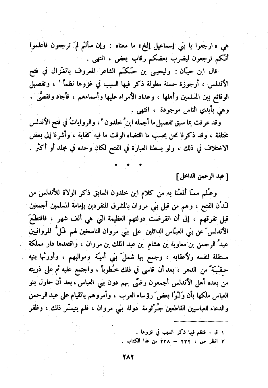 وقد عرفت بما سبق تفصيل ما أجمله ابن خلدون (2) ، والروايات في فتح الأندلس مختلفة، وقد ذكرنا نحن بحسب ما اقتضاه الوقت ما فيه كفاية، وأشرنا إلى بعض الاختلاف في ذلك، ولو بسطنا العبارة لكان وحده في مجلد أو أكثر.