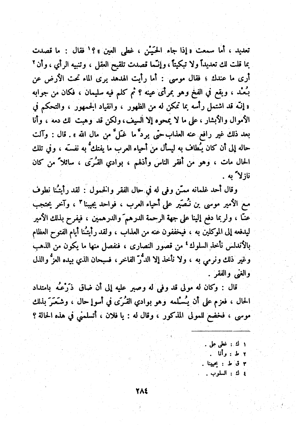 وقال أحد غلمانه ممّن وفى له في حال الفقر والخمول: لقد رأيتنا نطوف مع الأمير موسى بن نصير على أحياء العرب، فواحد يجيبنا (3) ، وآخر يحتجب عنّا، ولربما دفع إلينا على جهة الرحمة الدرهم والدرهمين، فيفرح بذلك الأمير ليدفعه إلى الموكلين به، فيخففون عنه من العذاب، ولقد رأيتنا أيام الفتوح العظام بالأندلس نأخذ السلوك (4) من قصور النصارى، فنفصل منها ما يكون من الذهب وغير ذلك ونرمي به، ولا نأخذ إلا الدّرّ الفاخر، فسبحان الذي بيده العزّ والذل والغنى والفقر.