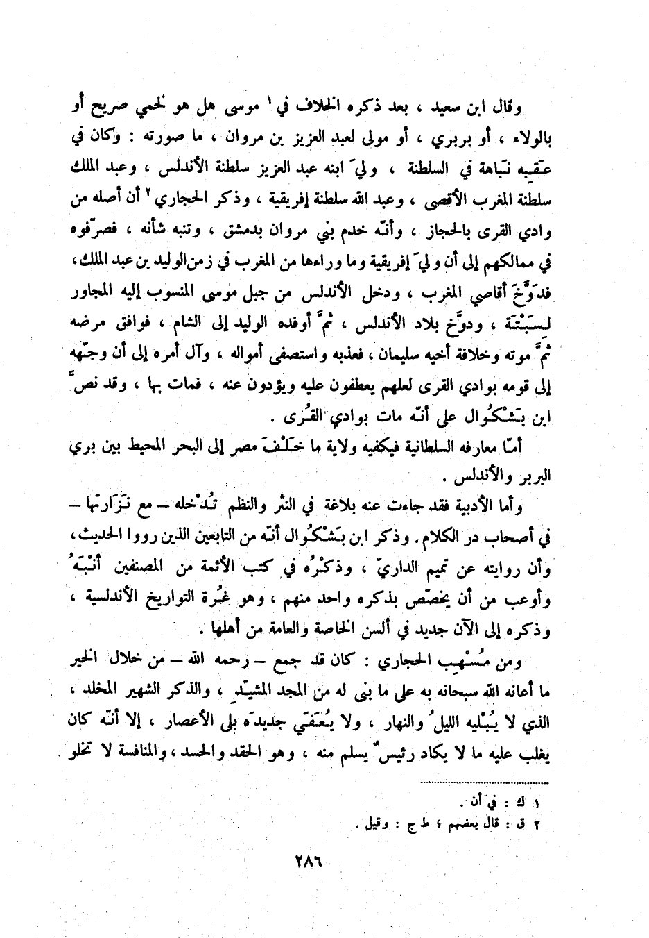 وقال ابن سعيد، بعد ذكره الخلاف في (1) موسى هل هو لخمي صريح أو بالولاء، أو بربري، أو مولى لعبد العزيز بن مروان، ما صورته: وكان في عقبه نباهة في السلطنة، ولي ابنه عبد العزيز سلطنة الأندلس، وعبد الملك سلطنة المغرب الأقصى، وعبد الله سلطنة إفريقية، وذكر الحجاري (2) أن أصله من وادي القرى بالحجاز، وأنّه خدم بني مروان بدمشق، وتنبه شأنه، فصرّفوه في ممالكهم إلى أن ولي إفريقية وما وراءها من المغرب في زمن الوليد بن عبد الملك، فدوّخ أقاصي المغرب، ودخل الأندلس من جبل موسى المنسوب إليه المجاور لسبتة، ودوّخ بلاد الأندلس، ثمّ أوفده الوليد إلى الشام، فوافق مرضه ثمّ موته وخلافة أخيه سليمان، فعذبه واستصفى أمواله، وآل أمره إلى أن وجّهه إلى قومه بوادي القرى لعلهم يعطفون عليه ويؤدون عنه، فمات بها، وقد نصّ ابن بشكوال على أنّه مات بوادي القرى.