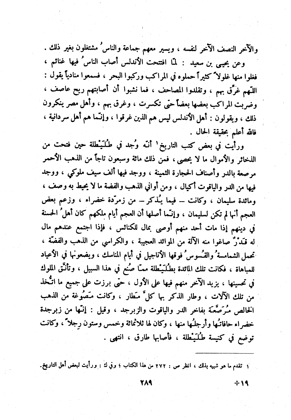 ورأيت في بعض كتب التاريخ (1) أنّه وجد في طليطلة حين فتحت من الذخائر والأموال ما لا يحصى، فمن ذلك مائة وسبعون تاجاً من الذهب الأحمر مرصعة بالدر وأصناف الحجارة الثمينة، ووجد فيها ألف سيف ملوكي، ووجد فيها من الدر والياقوت أكيال، ومن أواني الذهب والفضة ما لا يحيط به وصف، ومائدة سليمان، وكانت - فيما يذكر - من زمردة خضراء، وزعم بعض العجم أنها لم تكن لسليمان، وإنّما أصلها أن العجم أيام ملكهم كان أهل الحسنة في دينهم إذا مات أحد منهم أوصى بمال للكنائس، فإذا اجتمع عندهم مال له قدرٌ صاغوا منه الآلة من الموائد العجيبة، والكراسي من الذهب والفضّة، تحمل الشمامسة والقسوس فوقها الأناجيل في أيام المناسك، ويضعونها في الأعياد للمباهاة، فكانت تلك المائدة بطليطلة ممّا صنع في هذا السبيل، وتأنّق الملوك في تحسينها، يزيد الآخر منهم فيها على الأول، حتى برزت على جميع ما اتّخذ من تلك الآلات، وطار الذكر بها كلّ مطار، وكانت مصوغة من الذهب الخالص مرصّعة بفاخر الدر والياقوت والزبرجد، وقيل: إنّها من زبرجدة خضراء حافاتها وأرجلها منها، وكان لها ثلاثمائة وخمس وستون رجلاً، وكانت توضع في كنيسة طليطلة، فأصابها طارق، انتهى.