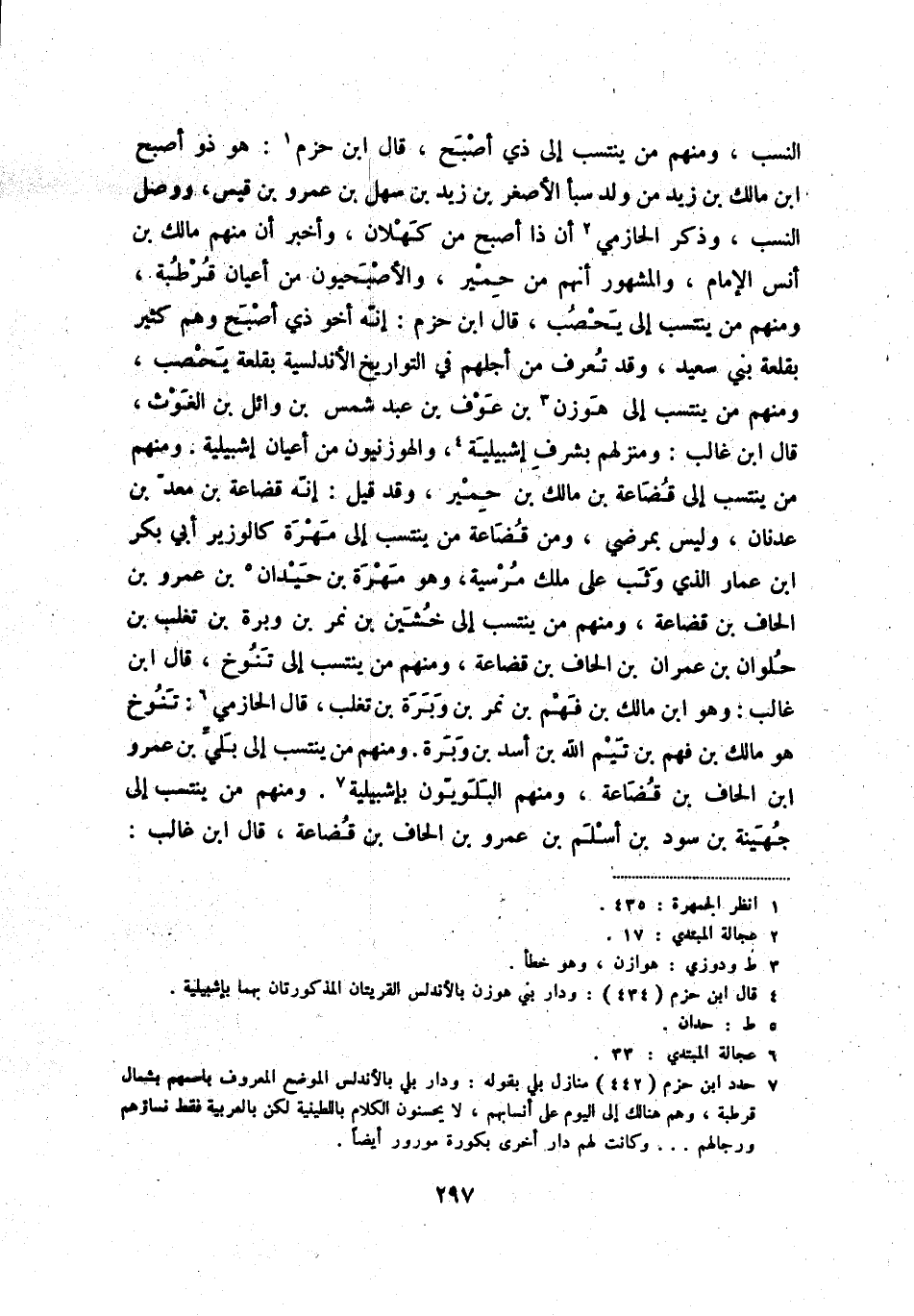النسب، ومنهم من ينتسب إلى ذي أصبح، قال ابن حزم (1) : وهو ذو أصبح ابن مالك بن زيد من ولد سبأ الأصغر بن زيد بن سهر بن عمرو بن قيس، ووصل النسب، وذكر الحازمي (2) أن ذا أصبح من كهلان، وأخبر أن منهم مالك بن أنس الإمام، والمشهور أنهم من حمير، والأصبحيون من أعيان قرطبة، ومنهم من ينتسب إلى يحصب، قال ابن حزم: إنّه أخو ذي أصبح وهم كثير بقلعة بني سعيد، وقد تعرف من أجلهم في التواريخ الأندلسية بقلعة يحصب، ومنهم من ينتسب إلى هوزن (3) بن عوف بن عبد شمس بن وائل بن الغوث، قال ابن غالب: ومنزلهم بشرف إشبيلية (4) ، والهوزنيون من أعيان إشبيلية. ومنهم من ينتسب إلى قضاعة بن مالك بن حمير، وقد قيل: إنّه قضاعة بن معدّ بن عدنان، وليس بمرضي، ومن قضاعة من ينتسب إلى مهرة كالوزير أبي بكر بن عمار الذي وثب على ملك مرسية، وهو مهرة بن حيدان (5) بن عمرو بن الحاف بن قضاعة، ومنهم من ينتسب إلى خشين بن نمر بن وبرة بن تغلب، قال الحازمي (6) : تنوخ هو مالك بن فهم بن تيم الله بن أسد بن وبرة. ومنهم من ينتسب إلى بليّ بن عمرو بن الحاف بن قضاعة، ومنهم البلويّون بإشبيلية (7) . ومنهم من ينتسب إلى جهينة بن سود بن أسلم بن عمرو بن الحاف بن قضاعة، قال ابن غالب: