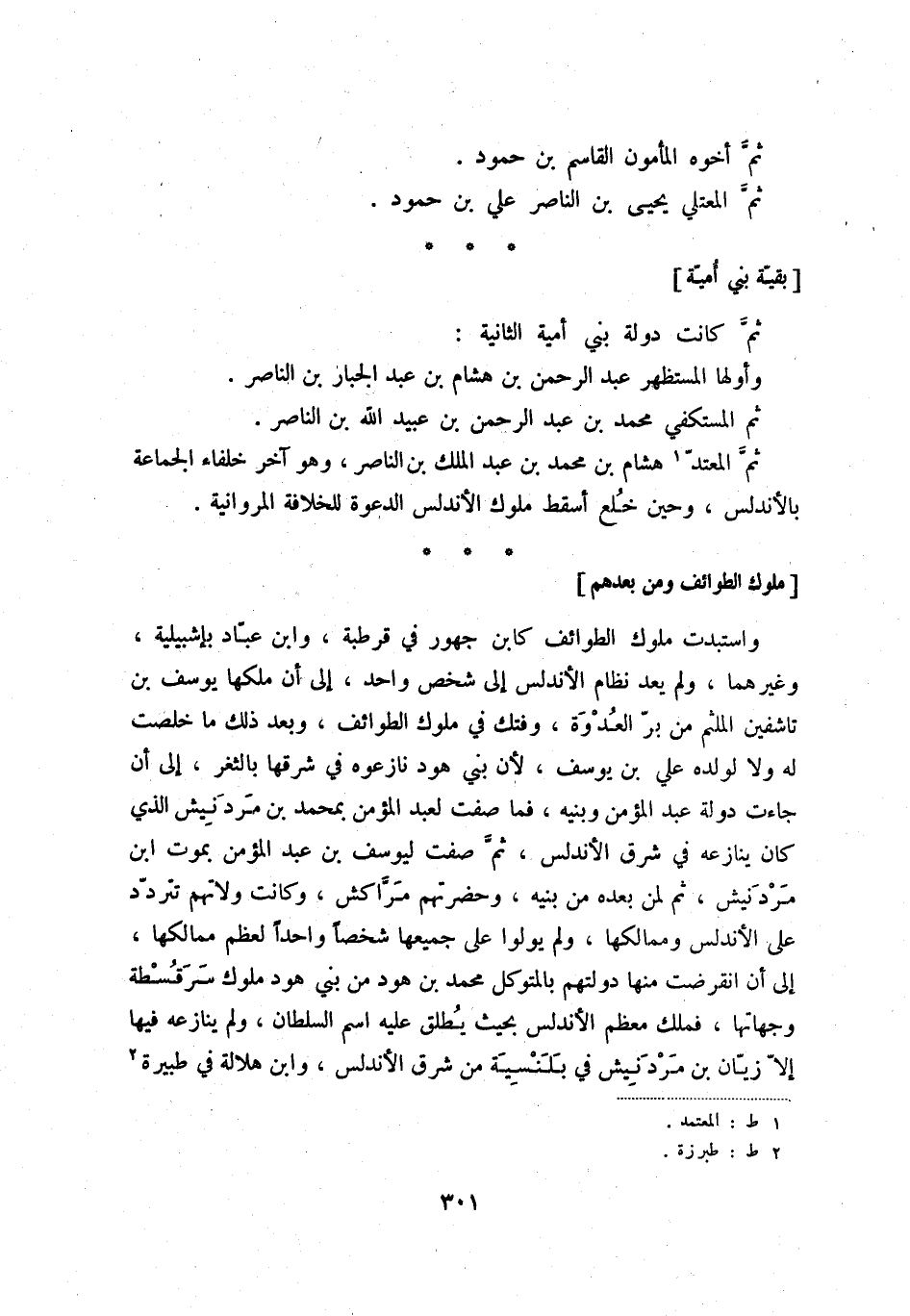 ثمّ المعتدّ (1) هشام بن محمد بن عبد الملك بن الناصر، وهو آخر خلفاء الجماعة بالأندلس، وحين خلع أسقط ملوك الأندلس الدعوة للخلافة المروانية.