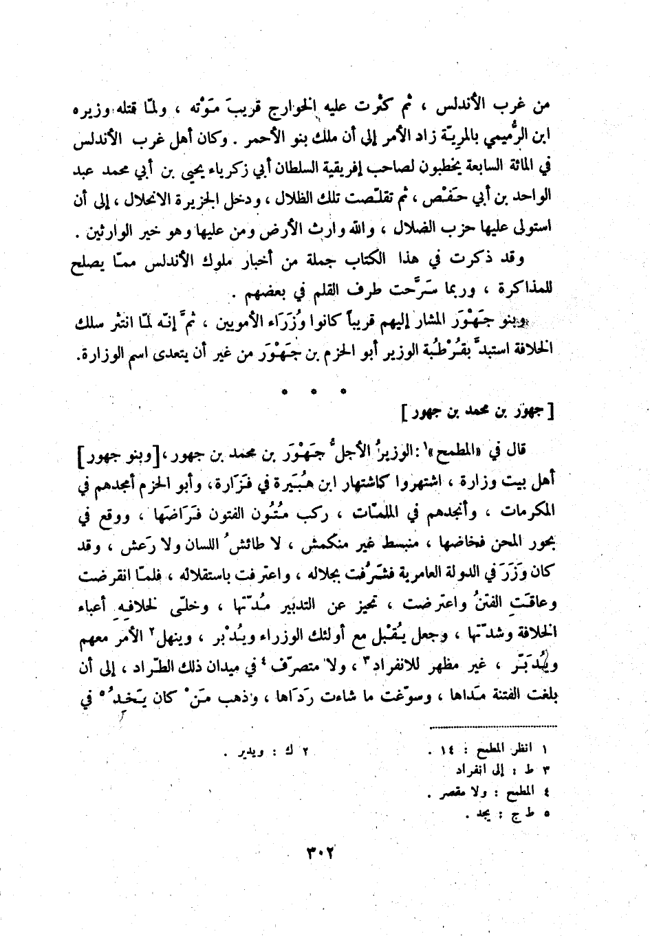 قال في " المطمح " (1) : الوزير الأجلّ جهور بن محمد بن جهور، [وبنو جهور] أهل بيت وزارة، واشتهروا كاشتهار ابن هبيرة في فزارة، وأبو الحزم أمجدهم في المكرمات، وأنجدهم في الملمّات، ركب متون الفتون فراضها، ووقع في بحور المحن فخاضها، منبسط غير منكمش، واعترفت باستقلاله، فلمّا انقرضت وعاقت الفتن واعترضت، تحيز عن التدبير مدّتها، وخلّى لخلافه أعباء الخلافة وشدّتها، وجعل يقبل مع أولئك الوزراء ويدبر، وينهل (2) الأمر معهم ويدبّر، غير مظهر للانفراد (3) ، ولا متصرّف (4) في ميدان ذلك الطّراد، إلى أن بلغت الفتنة مداها، وسوّغت ما شاءت رداها، وذهب من كان يخد (5) في