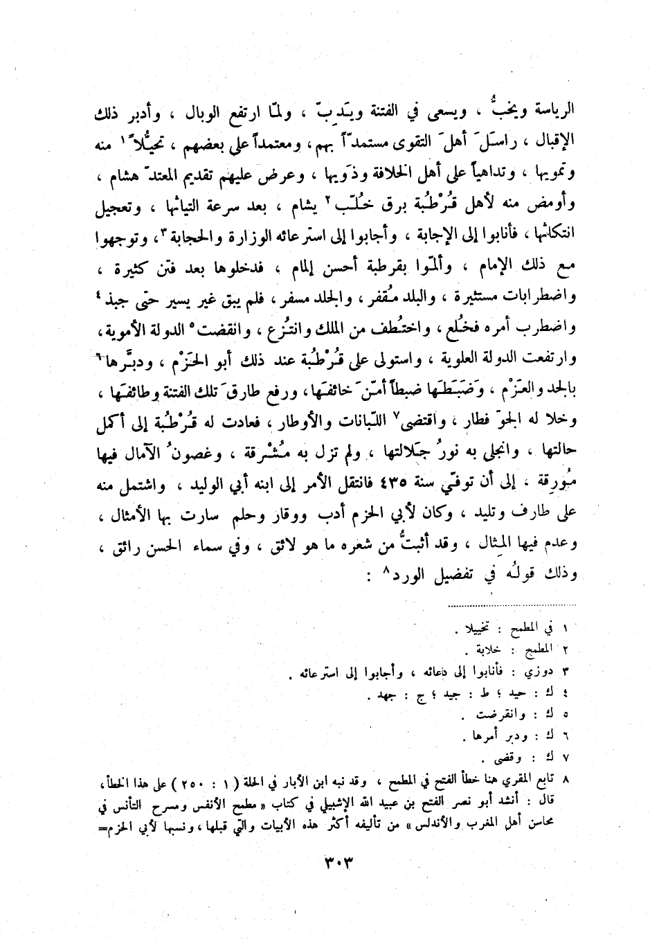 (8) تابع المقري هنا خطأ الفتح في المطمح، وقد نبه ابن الأبار في الحلة (1: 250) على هذا الخطأ، قال: أنشد أبو نصر الفتح بن عبيد الله افشبيلي في كتاب " مطمح الأنفس ومسرح التأنس في محاسن أهل المغرب والأندلس " في تأليفه أكثر هذه الأبيات والتي قبلها، ونسبها لأبي الحزم جهور بن محمد بن جهور رئيس قرطبة المتخر غلطاً منه ووهماً لإخفاء به وإنما هي لجده جهور ابن عبيد الله [بن أبي عبدة الوزير] . قلت: انظر ترجمة جهور أبي الحزم ف الحلة 2: 30.