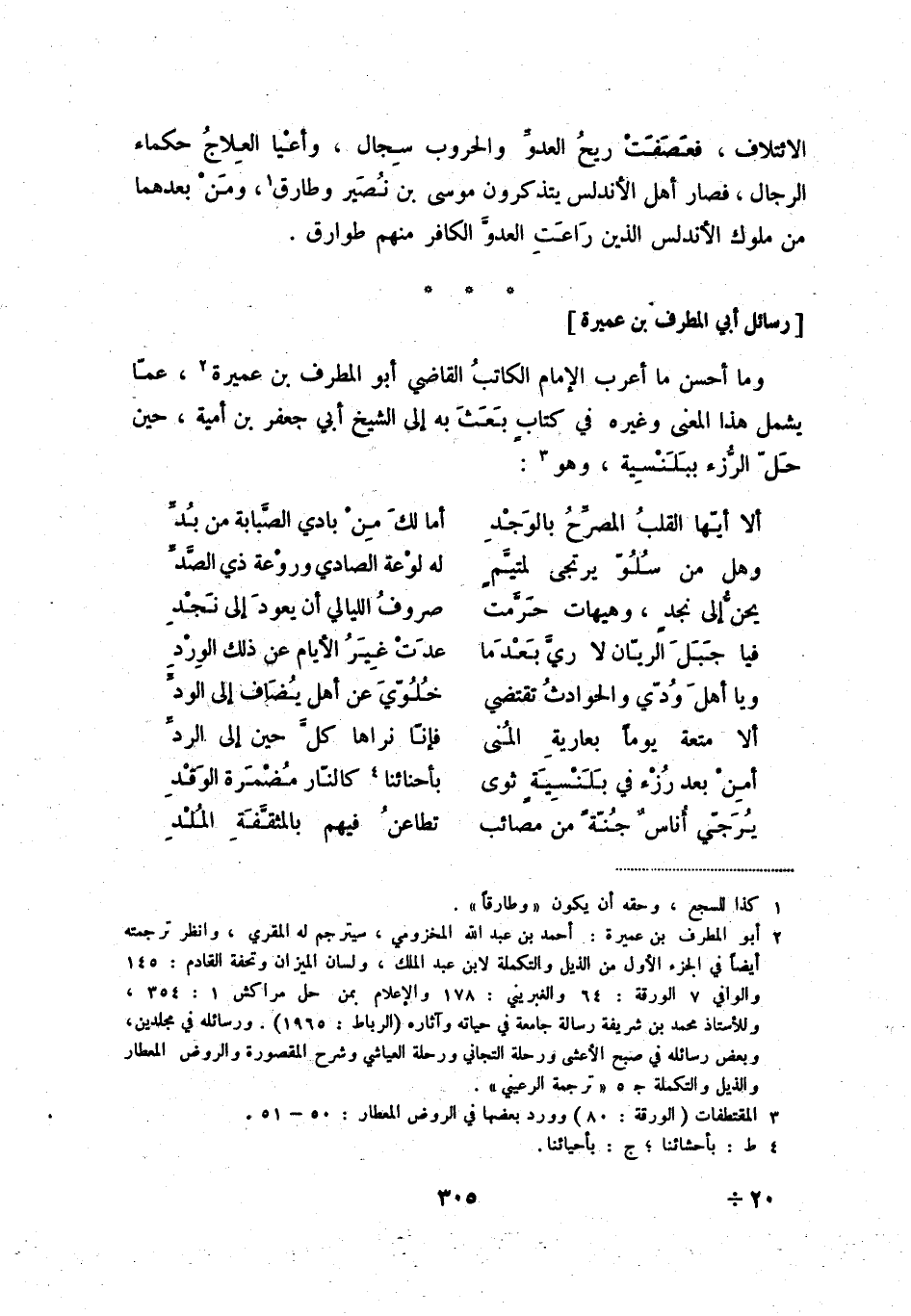 (2) أبو المطرف بن عميرة: أحمد بن عبد الله المخزومي، سيترجم له المقري، وانظر ترجمته أيضاً في الجزء الأول من الذيل والتكملة لابن عبد الملك، ولسان الميزان وتحفة القادم: 145 والوافي 7 الورقة: 64 والغبريني: 178 والإعلام بمن حل مراكش 1: 354، وللأستاذ محمد بن شريفة رسالة جامعة ف حياته وآثاره (الرباط: 1965) . ورسائله في مجلدين، وبعض رسائله في صبح الأعشى ورحلة التجافي ورحلة العياشي وشرح المقصورة والروض المعطار والذيل والتكملة ج؟ 5 " ترجمة الرعيني "،