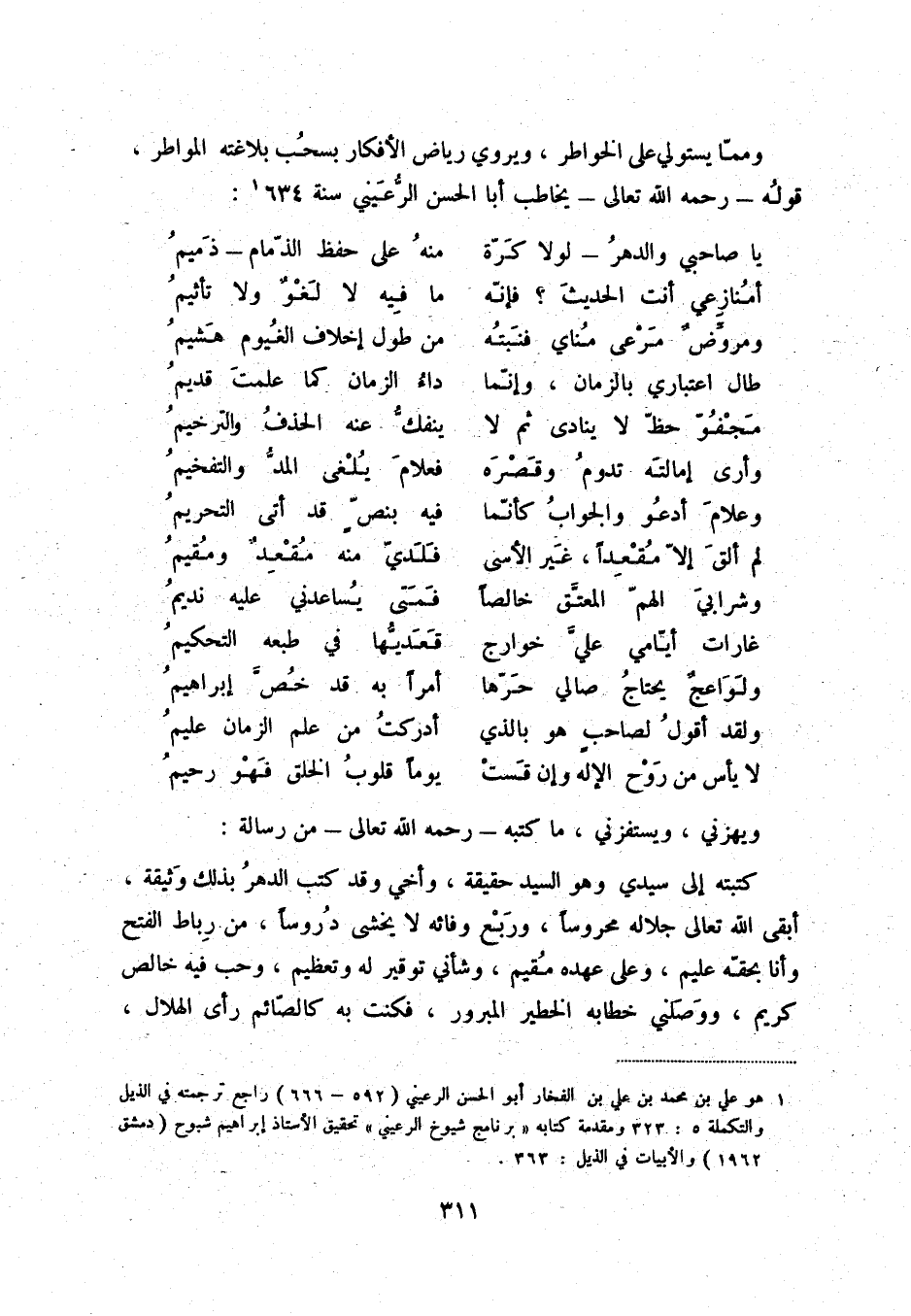 (1) هو علي بن محمد بن علي بن الفخار أبو الحسن الرعيني (592 - 666) راجع ترجمته في الذيل والتكملة 5: 323 ومقدمة كتابه " برنامج شيوخ الرعيني " تحقيق الأستاذ إبراهيم شبوح (دمشق 1962) والأبيات في الذيل: 363.