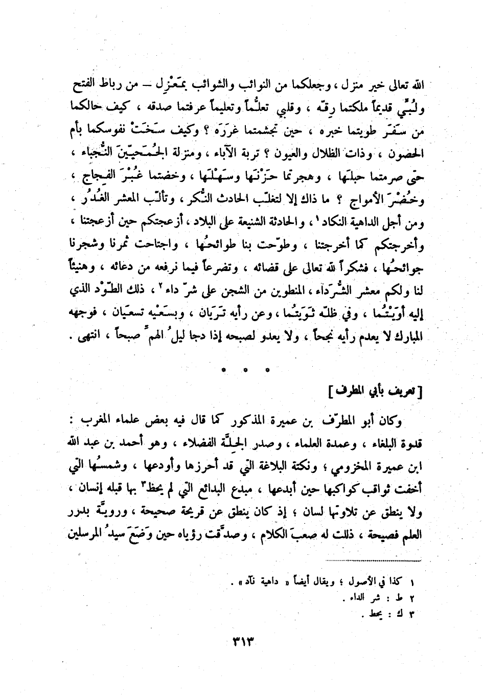 الله تعالى خير منزل، وجعلكما من النوائب والشوائب بمعزل - من رباط الفتح ولبّي قديماً ملكتما رقّه، وقلبي تعلّماً وتعليماً عرفتما صدقه، كيف حالكما من سفر طويتما خبره، حين تجشمتما غرره؟ وكيف سخت نفوسكما بأم الحصون، وذات الظلال والعيون؟ تربة الآباء، ومنزلة الجمحيّين النّجباء، حتى صرمتما جبلها، وهجرتما حزنها وسهلها، وخضتما غير الفجاج، وخضر الأمواج؟ ما ذاك إلا لتغلّب الحدث النّكر، وتألّب المعشر الغدر، ومن أجل الداهية النكاد (1) ، والحادثة الشنيعة على البلاد، أزعجتكم حين أزعجتنا، وأخرجتكم كما أخرجتنا، وطوّحت بنا طوائحها، واجتاحت ثمرنا وشجرنا جوائحها، فشكراً لله تعالى على قضائه، وتضرعاً فيما نرفعه من دعائه، وهنيئاً لنا ولكم معشر الشّرداء، المنطوين من الشجن على شرّ داء (2) ، ذلك الطّود الذي إليه أويتما، وفي ظلّه ثويتما، وعن رأيه تريان، وبسعيه تسعيان، فوجهه المبارك لا يعدم رأيه نجحاً، ولا يعدو لصبحه إذا دجا ليل الهمّ صبحاً، انتهى.