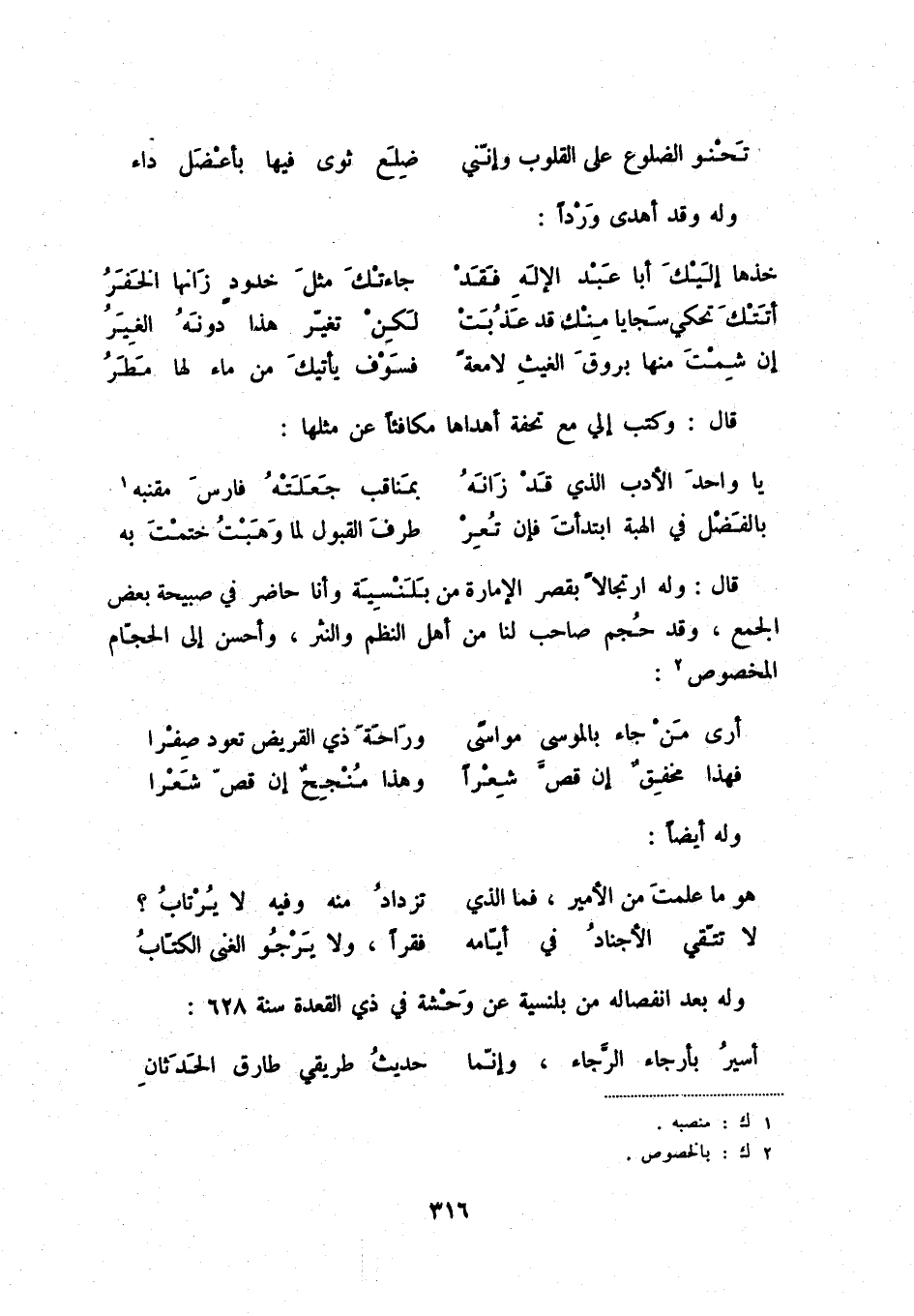 لا تتّقي الأجناد في أيّامه ... فقراً، ولا يرجو الغنى الكتّاب وله بعد انفصاله من بلنسية عن وحشة في ذي القعدة سنة 628: