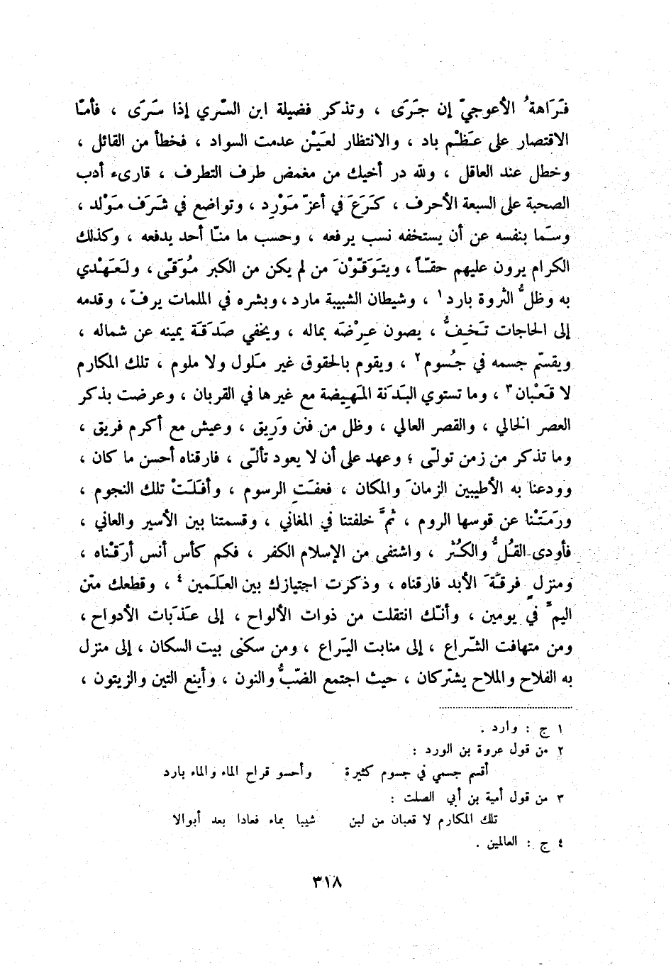فراهة الأعوجيّ إن جرى، وتذكر فضيلة ابن السّري إذا سرى، فأمّا الاقتصار على عظم باد، والانتظار لعين عدمت السواد، فخطأ من القائل، وخطل عند العاقل، ولله در أخيك من مغمض طرف التطرف، قارئ أدب الصحبة على السبعة الأحرف، كرع في أعزّ مورد، وتواضع في شرف مولد، وسما بنفسه عن أن يستخفه نسب يرفعه، وحسب ما منّا أحد يدفعه، وكذلك الكرام يرون عليهم حقّاً، ويتوقّون من لم يكن من الكبر موقّى، ولعهدي به وظلّ الثروة بارد (1) ، وشيطان الشبيبة مارد، وبشره في الملمات يرفّ، وقدمه إلى الحاجات تخفّ، يصون عرضه بماله، ويخفي صدقة يمينه عن شماله، ويقسّم جسمه في جسوم (2) ، ويقوم بالحقوق غير ملول ولا ملوم، تلك المكارم لا قعبان (3) ، وما تستوي البدنة المهيضة م غيرها في القربان، وعرضت بذكر العصر الخالي، والقصر العالي، وظل من فنن وريق، وعيش مع أكرم فريق، وما تذكر من زمن تولّى؛ وعهد على أن لا يعود تألّى، فارقناه أحسن ما كان، وودعنا به الأطيبين الزمان والمكان، فعفت الرسوم، وأفلت تلك النجوم، ورمتنا عن قوسها الروم، ثمّ خلفتنا في المغاني، وقسمتنا بين الأسير والعاني، فأودى القلّ والكثر، واشتفى من الإسلام الكفر، فكم كأس أنس أرقناه، ومنزلٍ فرقة الأبد فارقناه، وذكرت اجتيازك بين العلمين (4) ، وقطعك متن اليمّ في يومين، وأنّك انتقلت من ذوات الألواح، إلى عذبات الأدواح، ومن متهافت الشّراع، إلى منابت اليراع، ومن سكنى بيت السكان، إلى منزل به الفلاح والملاح يشتركان، حيث اجتمع الضّبّ والنون، وأينع التين والزيتون،